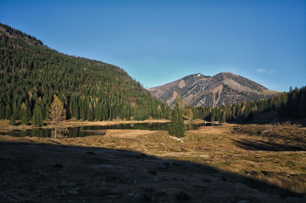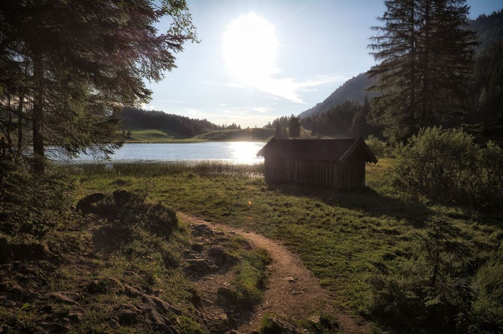 An der Straßengabelung haben wir die Qual der Wahl: Gehen wir links oder rechts herum? Es gibt hier keine Empfehlung. Rechts herum betreten wir zuerst die Seewaldalm am Südufer, mit Zugang zur Wasserfläche, links herum führt der Weg erst durch den Hangwald am Nordufer.
