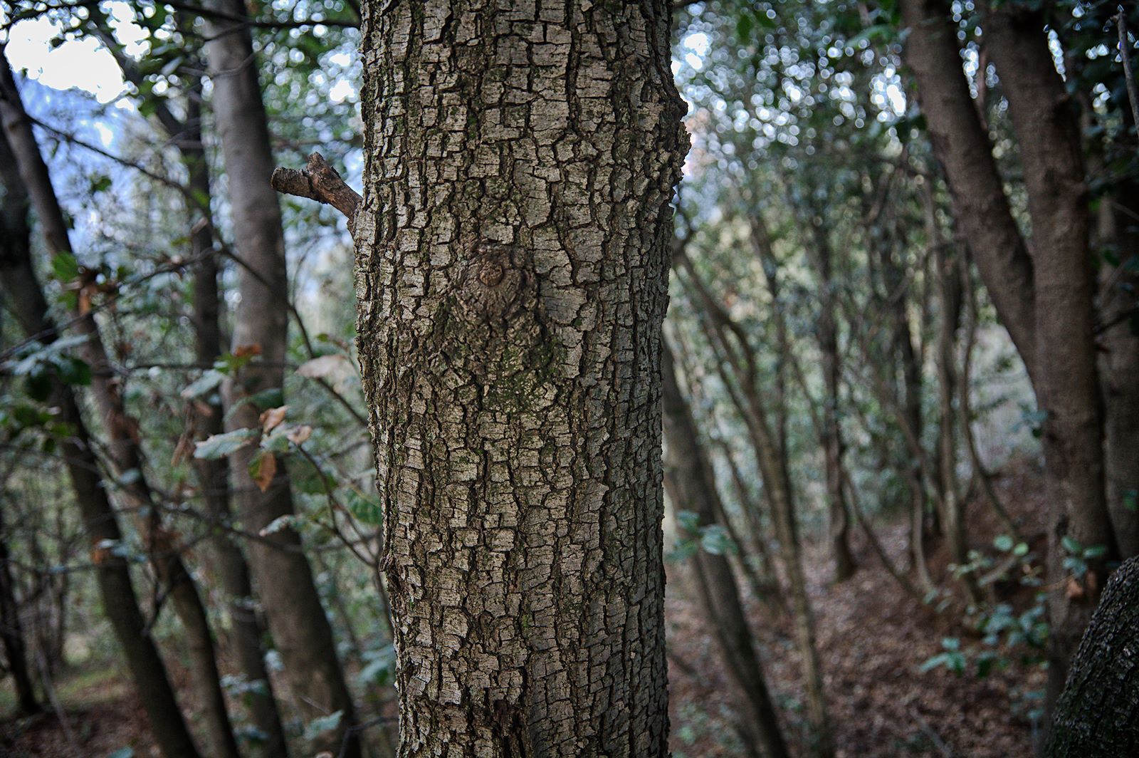 Immergrün trifft auf sommergrün im Wald auf dem Monte Brione. Hier die Borke der sommergrünen Hopfenbuche