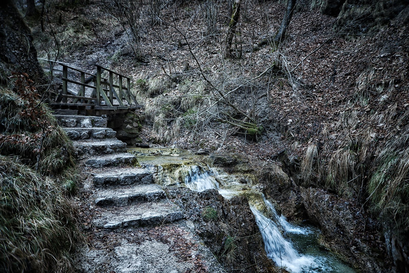 Nach zwei Kilometern erreichen wir die Eintrittspforte zum Nixenfall. Nichts deutet in diesem sanften Hangwald darauf hin, dass wir sogleich in einer wildromantischen Felslandschaft stehen könnten. So folgen wir dem schmalen Pfad entlang eines kleinen Baches, der neben uns ruhig dahin plätschert. Nach einer Kurve wähnen wir uns sogleich von steilem Gelände umgeben. Nach nur wenigen Metern und ein paar Stufen können wir bereits das Ende dieser kleinen Schlucht erkennen: Es ist ein enger Talkessel und an der linken Felswand hängt das lange, weiße Haar einer Nixe, das im Wind wabert.
