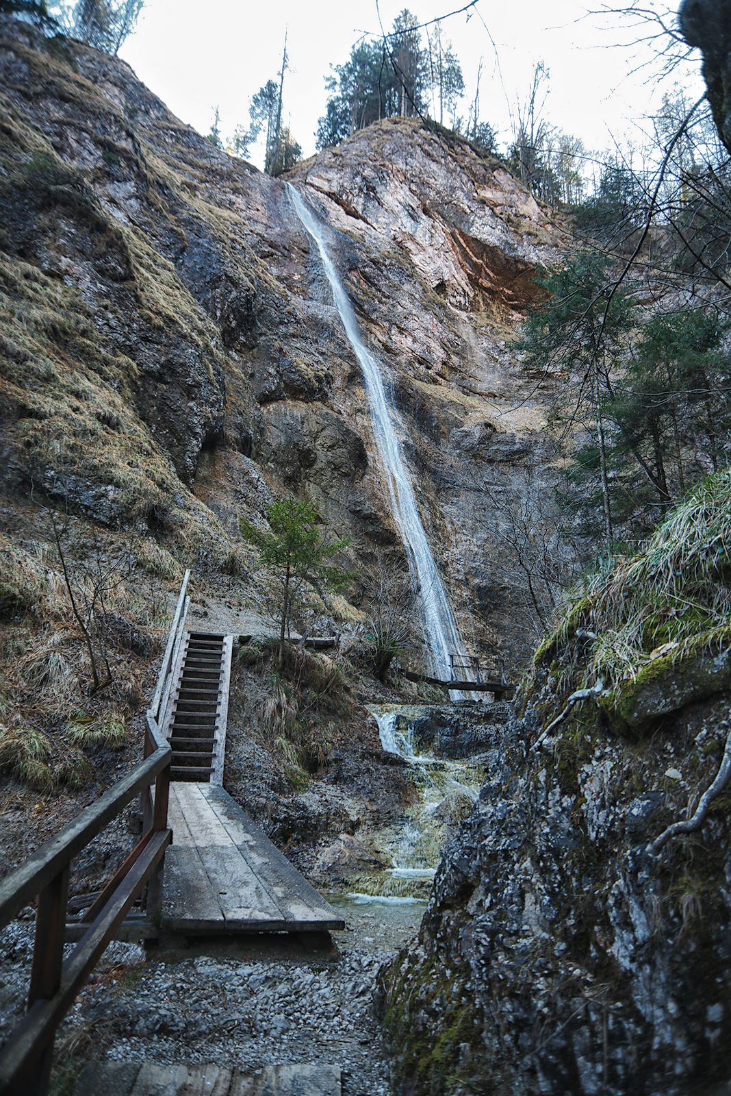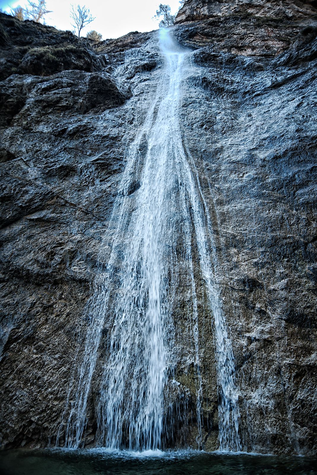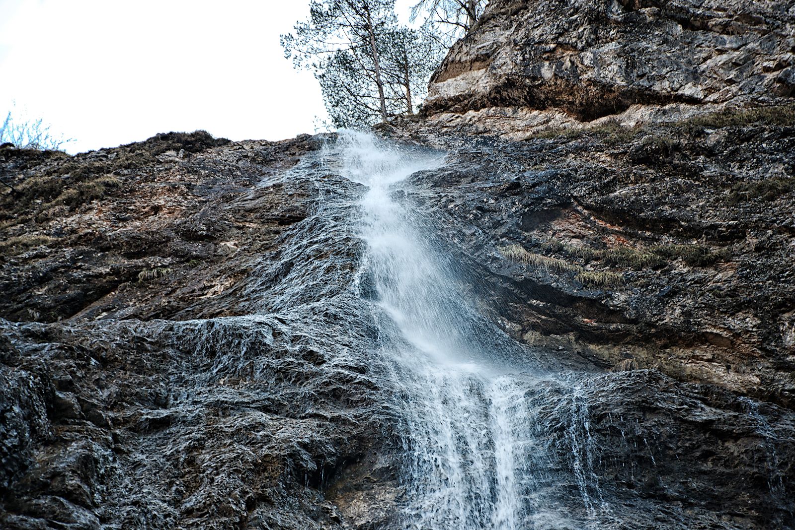 Oh, Moment, das ist kein Haar, das ist doch Wasser! Sechzig Meter fällt es herab in den Talkessel. Und die Nixe sitzt an der Felswand gegenüber. 😉 Die Wassermenge ist nicht groß, der Wasserfall dennoch äußerst spektakulär. An heißen Sommertagen ist es in dieser schattigen, von der Außenwelt nur über den schmalen Pfad entlang des Baches erreichbaren Schlucht angenehm kühl.