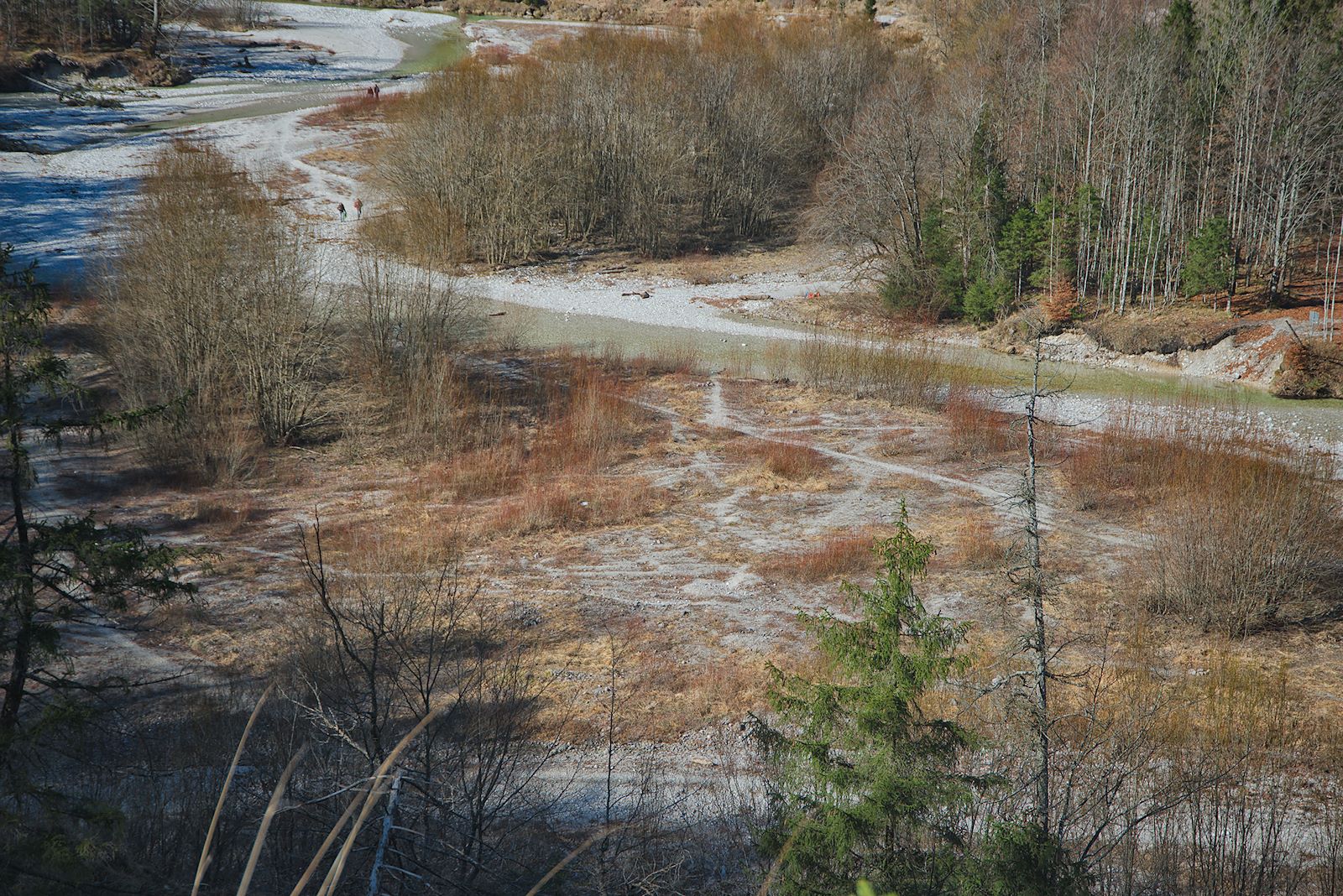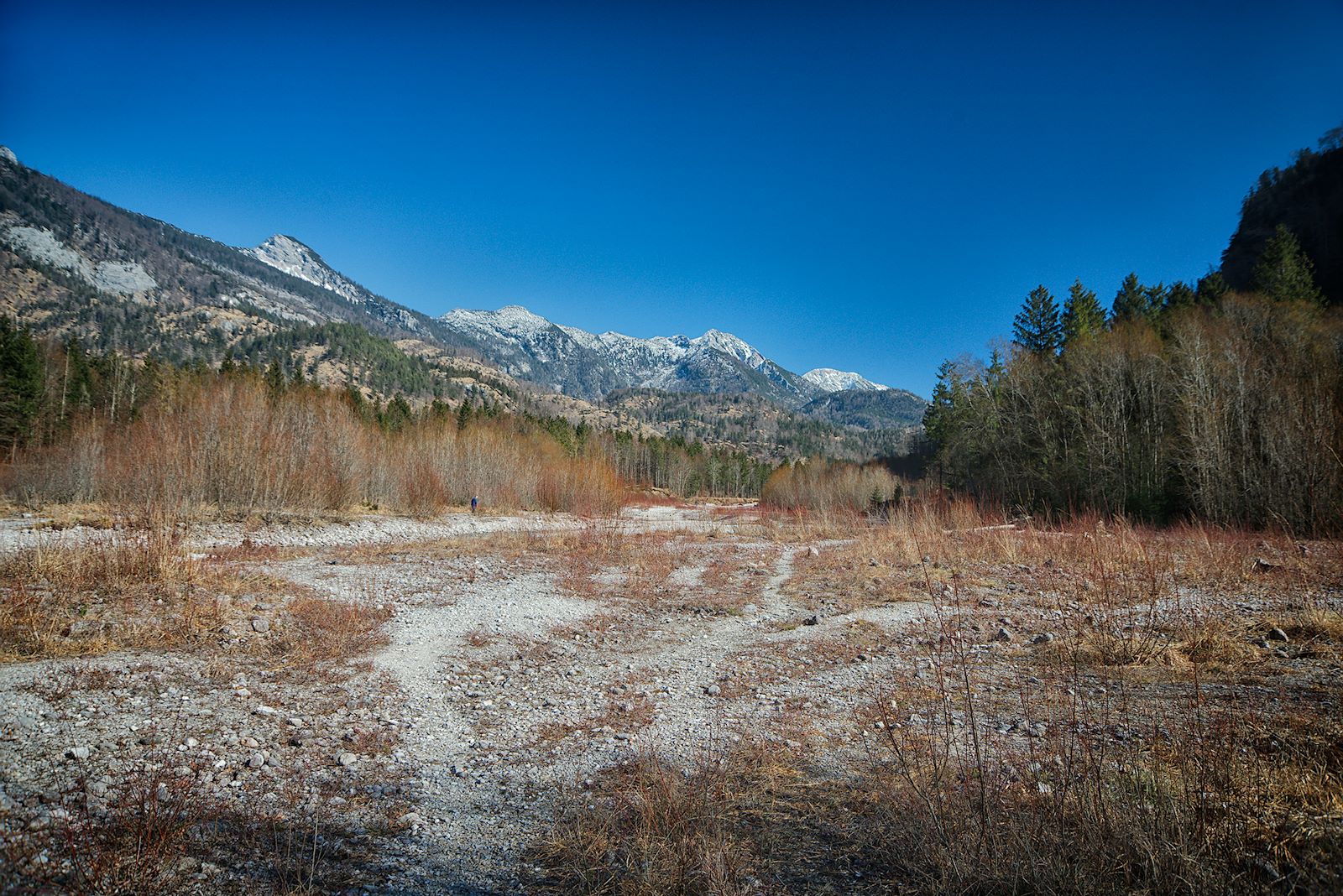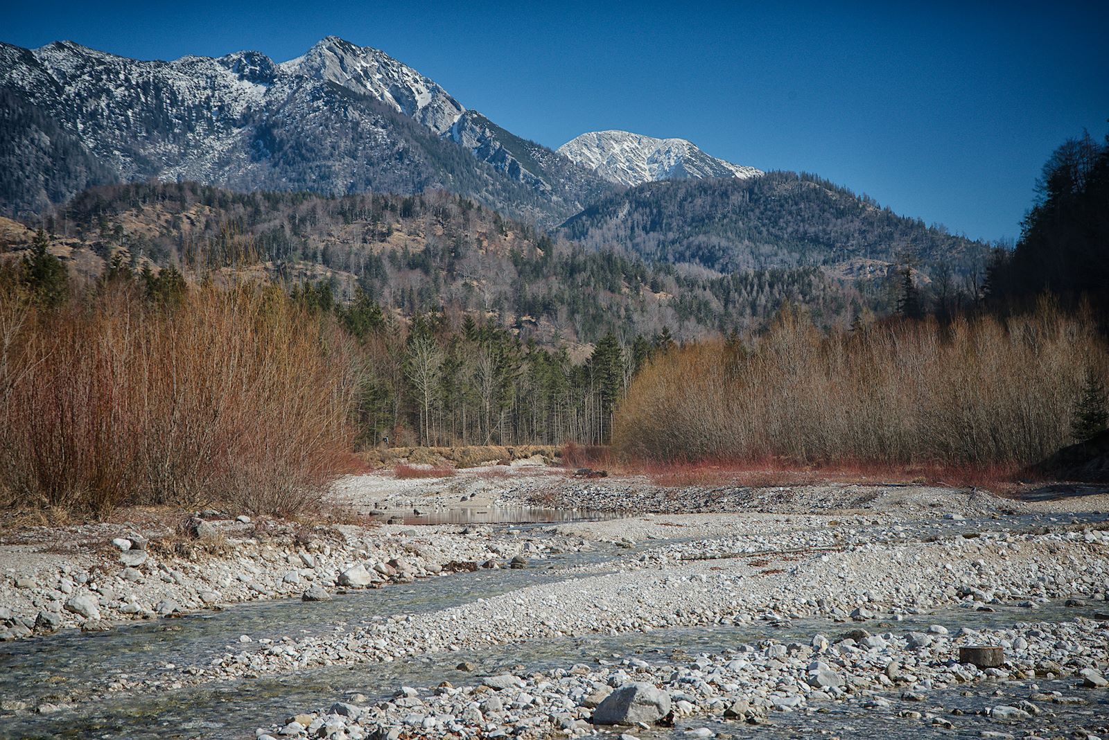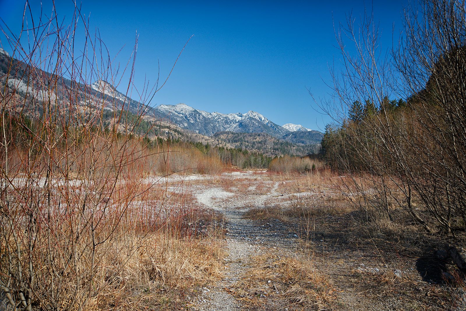 Also klettern wir die kleine Böschung hinunter zum Fluss. Denn dort in der Sonne wollen wir unsere Pause einlegen. Es ist wunderschön. In der großen Schotterfläche zieht der Weißenbach seine Mäander, teilt sich immer wieder in Nebenarme die sich weiter unten wieder vereinigen. Überall wachsen Weiden, die ihre jungen, knallroten Zweige der Sonne entgegenstrecken. Die vertrockneten Grashalme des letzten Sommers tauchen den Boden in gelbe Farbe und im Hintergrund thronen die noch schneebedeckten Gipfel des Höllengebirges unter einem tiefblauen Himmel. Fast schon kitschig.
