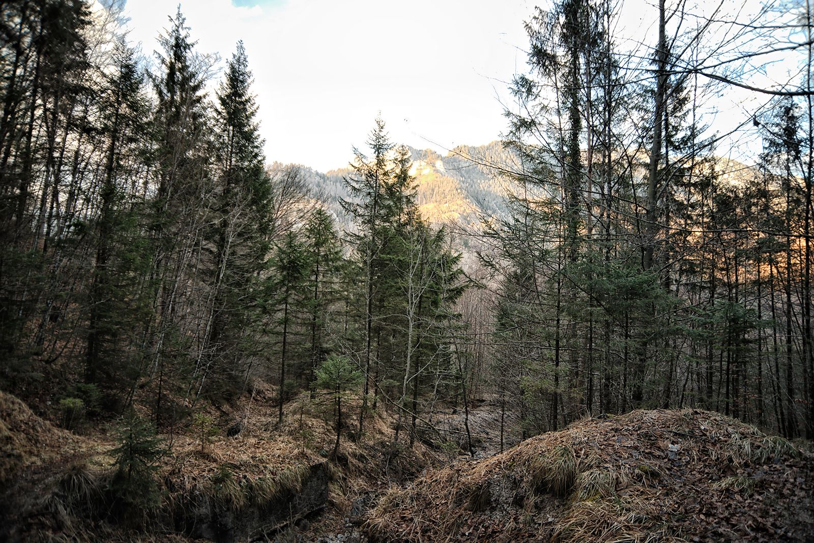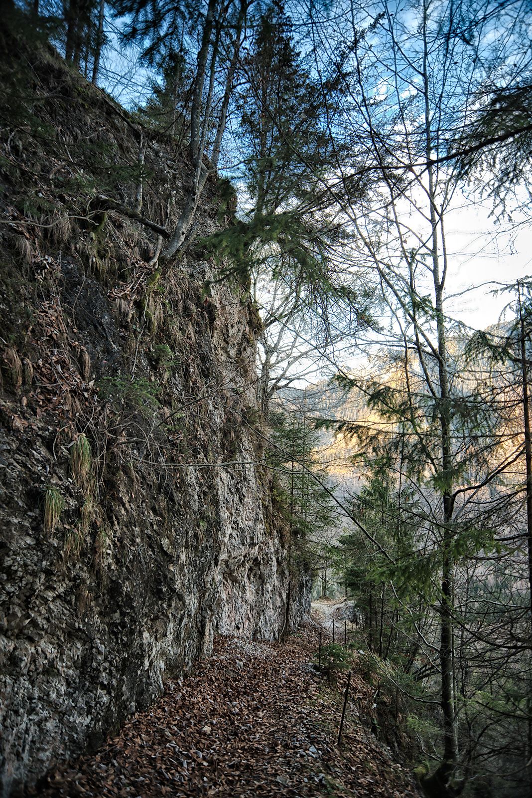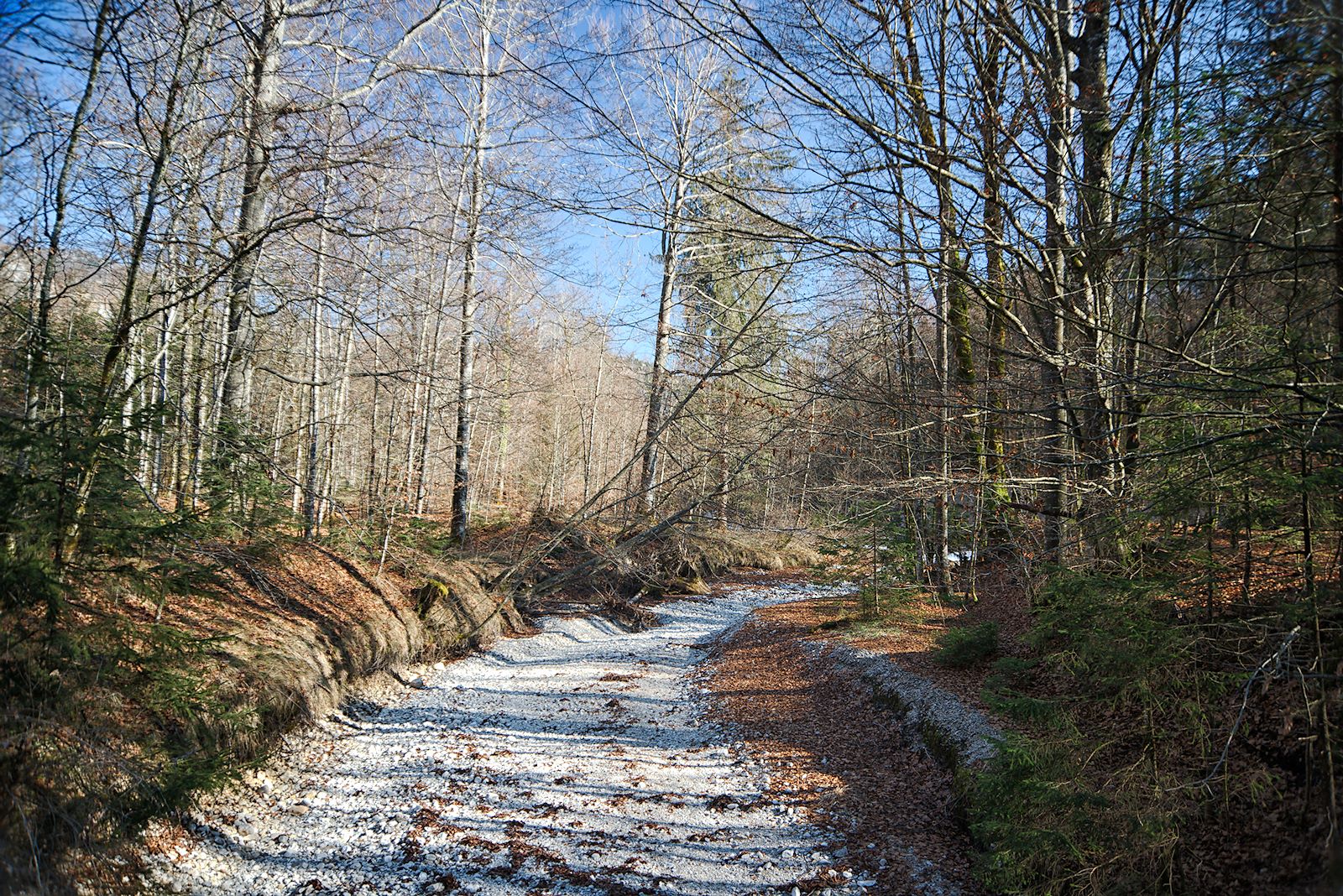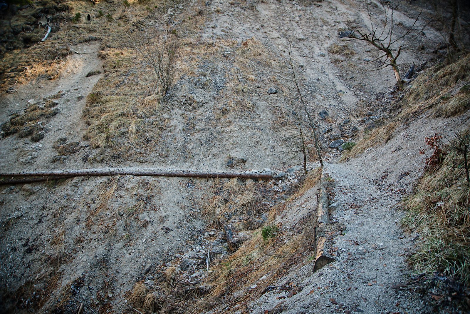 Teilweise hat sich die ehemalige Forststraße komplett aufgelöst und so geht es mitunter etwas abenteuerlich durch ausgewaschene Hohlwege, vorbei an einer eingestürzten Brücke, die einst einen Graben überspannte und unterhalb einer kleinen Felswand hinunter ins Tal. Auch mit Aussicht auf das Alpenglühen im Höllengebirge wird dabei nicht gegeizt.