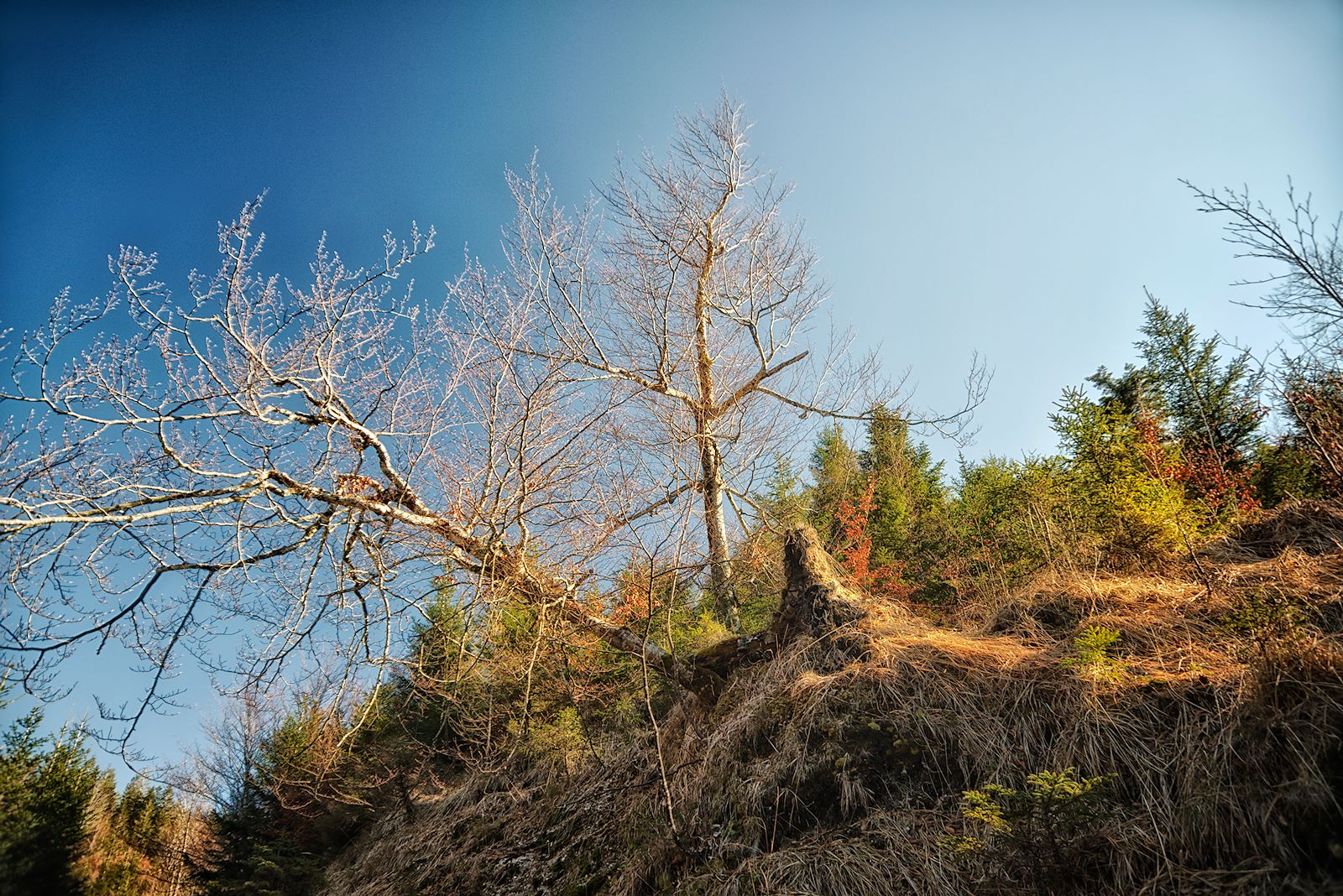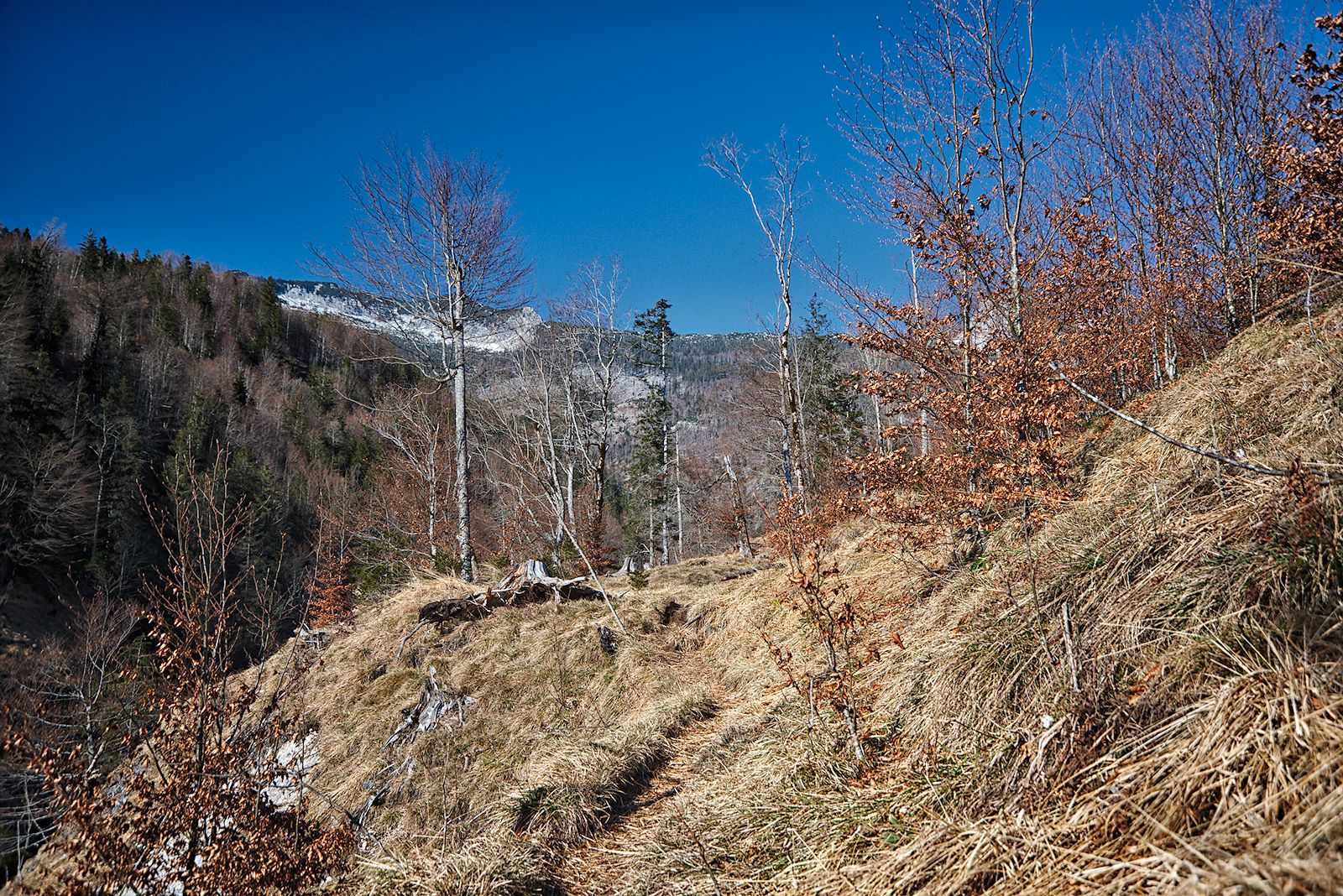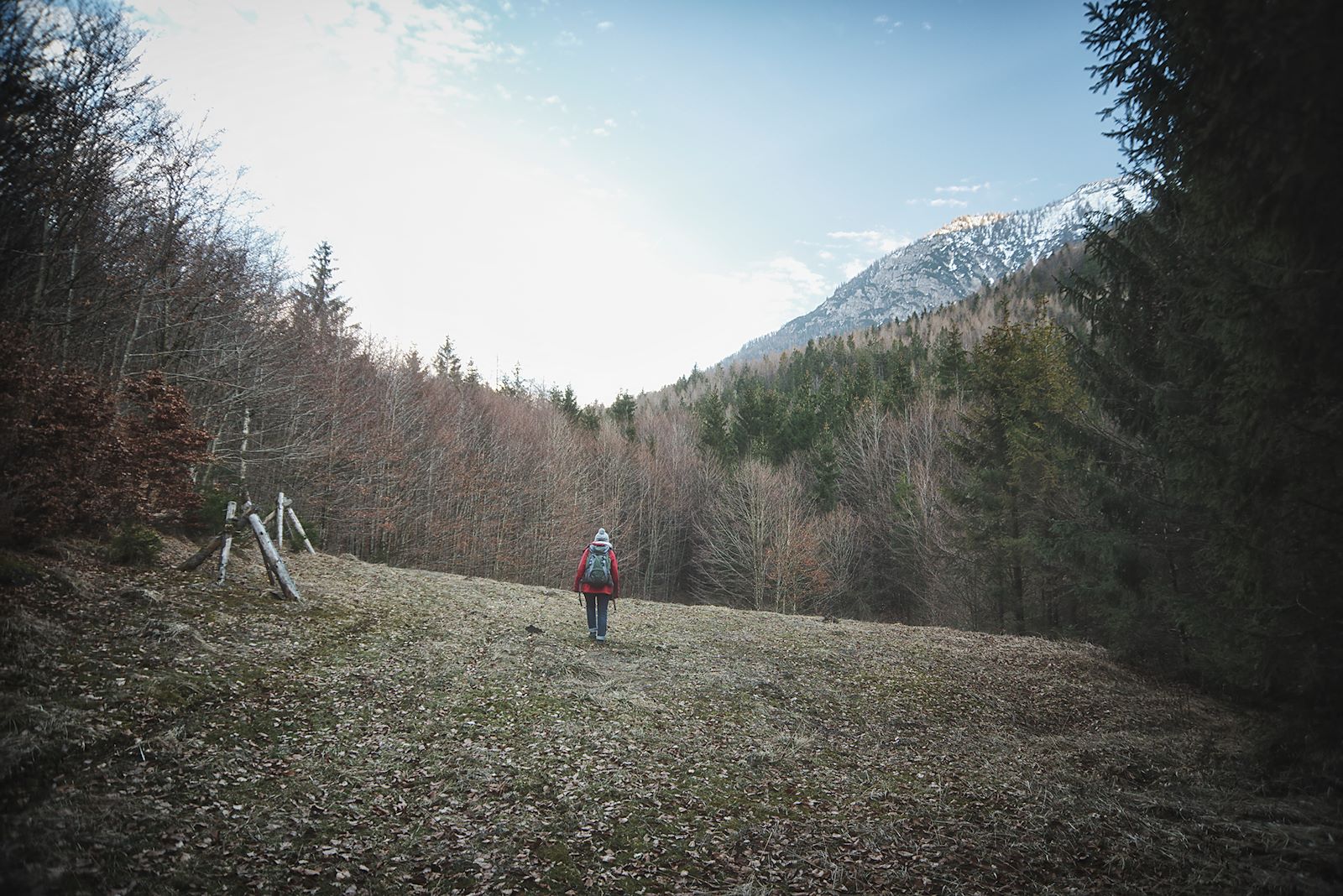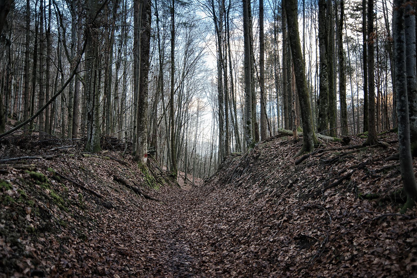 Teilweise hat sich die ehemalige Forststraße komplett aufgelöst und so geht es mitunter etwas abenteuerlich durch ausgewaschene Hohlwege, vorbei an einer eingestürzten Brücke, die einst einen Graben überspannte und unterhalb einer kleinen Felswand hinunter ins Tal. Auch mit Aussicht auf das Alpenglühen im Höllengebirge wird dabei nicht gegeizt.