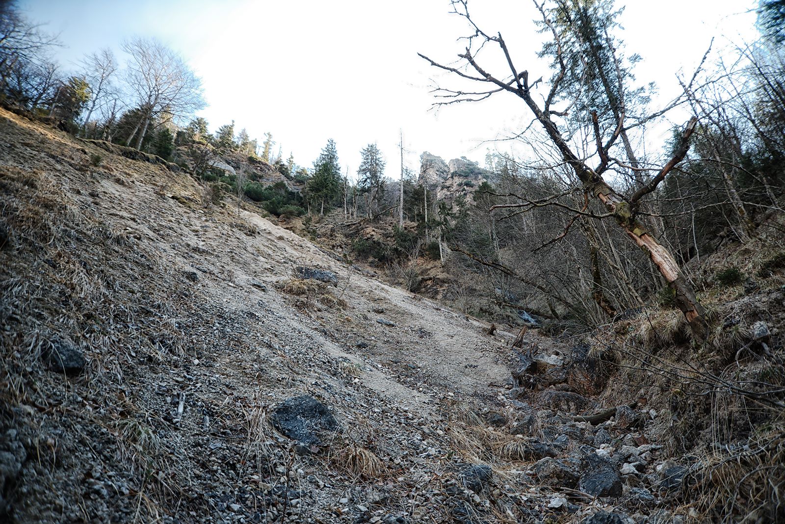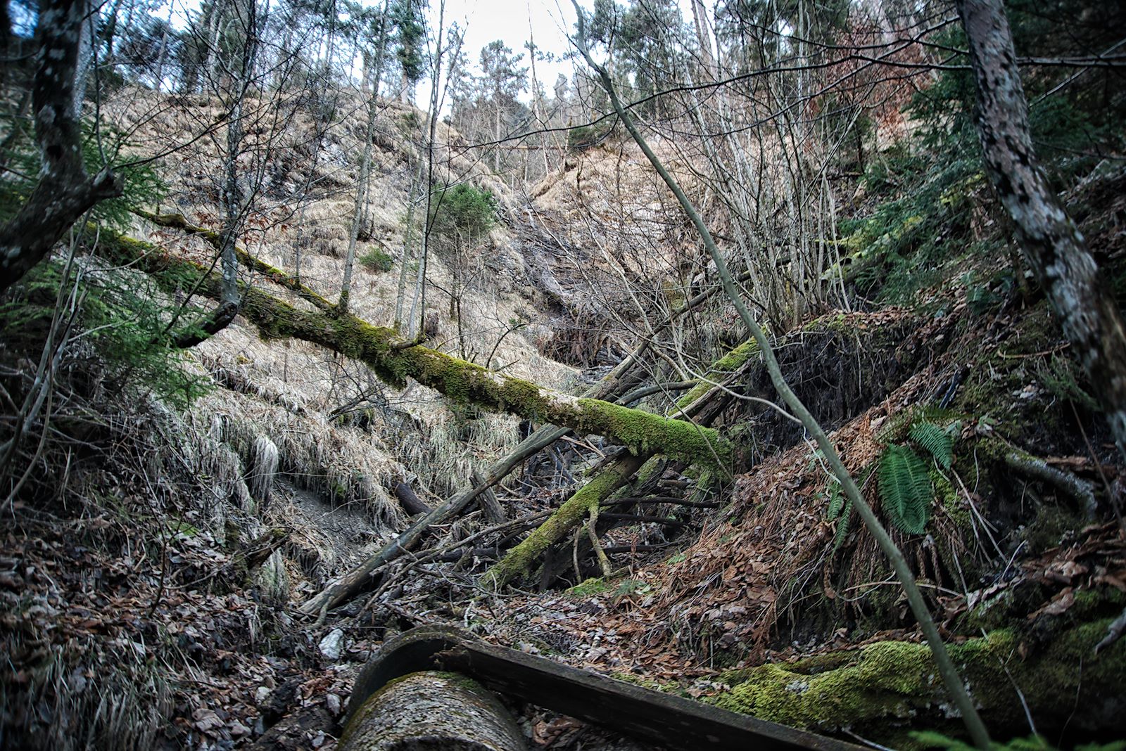 Am Eibenbergsattel verlässt der Wanderweg schließlich die Forststraße und führt auf einem alten, aufgelassenen Forstweg wieder hinunter in das Weißenbachtal. Dabei queren wir auch jenen Bach, der gleich darauf über eine 60 Meter hohe Felswand hinunter ins Tal stürzt. Richtig, ich spreche vom Nixenfall, dem ersten Highlight des heutigen Tages. Einsehbar ist die Fallkante von oben nicht, doch die schroffe Felslandschaft unterhalb des Weges lässt schon ahnen, was da noch kommt.