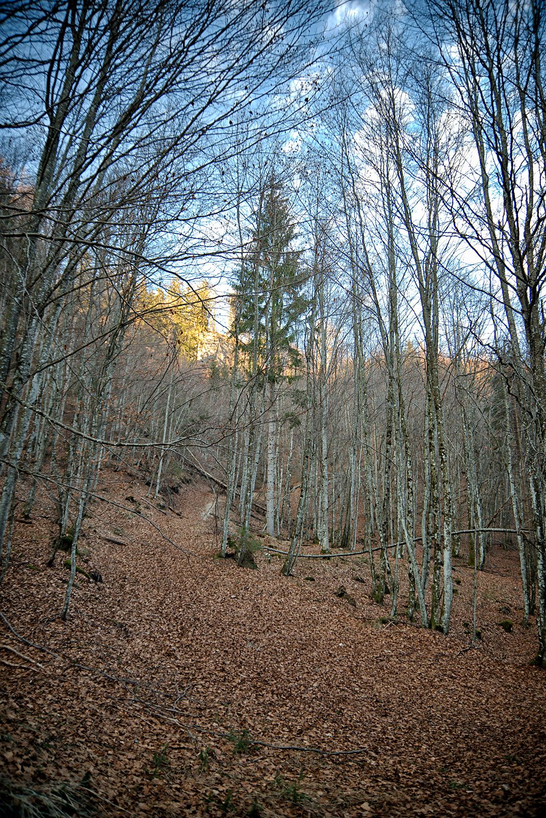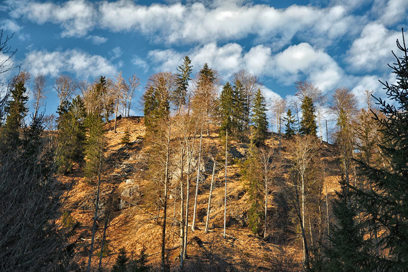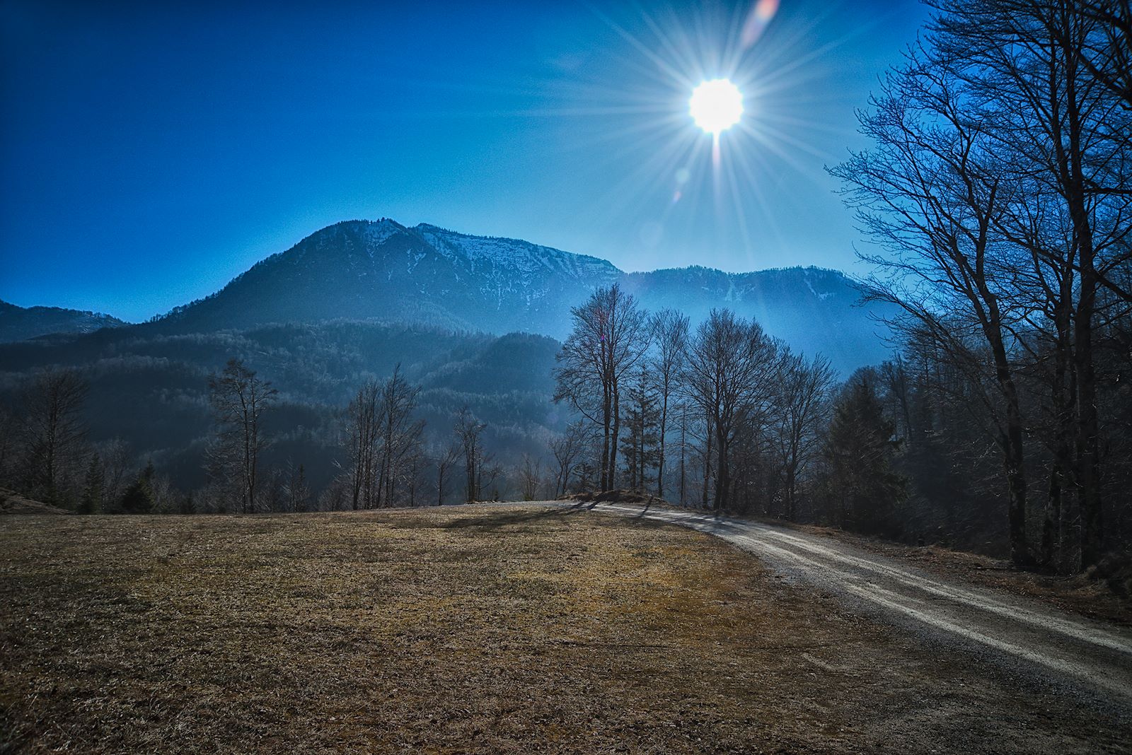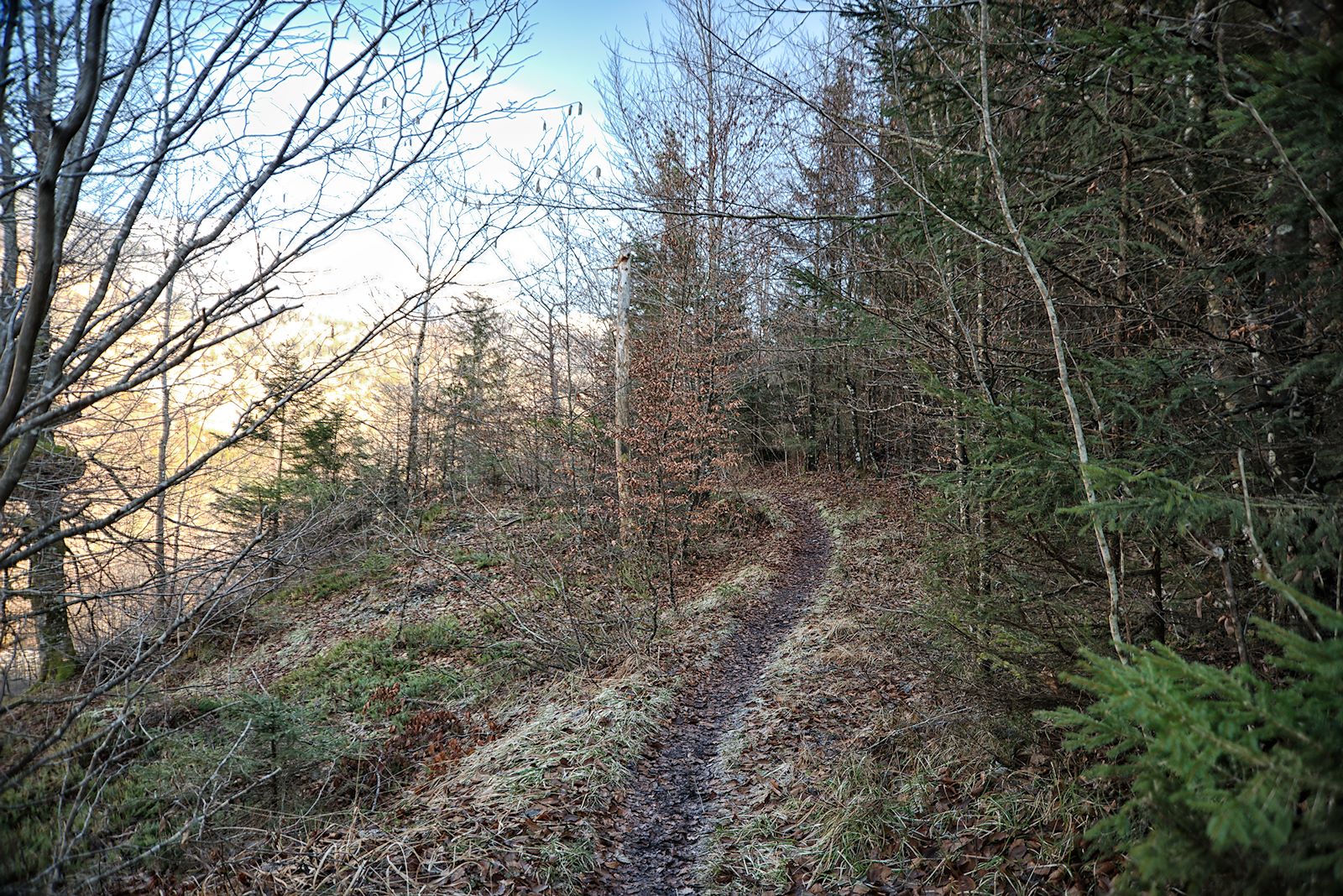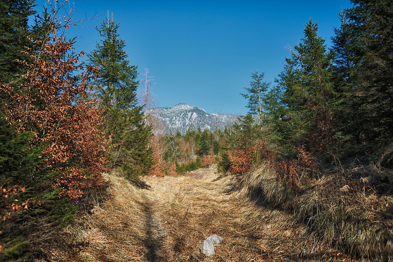 No risk, no fun! Also nehmen wir, wie geplant, den Rückweg hinter dem Eibenberg herum. Ausnahmsweise drücken wir mal etwas aufs Tempo, damit sich das alles noch ausgeht. Aber wir sollten es nicht bereuen. Der Anstieg auf den Eibenbergsattel erfolgt über eine Forststraße, die uns mit leichter Steigung etwa 180 Höhenmeter hinauf führt. Die letzten Sonnenstrahlen, viele kleine Bachläufe, sowie der Ausblick auf den Leonsberg im Süden und natürlich auf den noch sonnenbestrahlten Eibenberg machen diesen Abschnitt sehr kurzweilig.