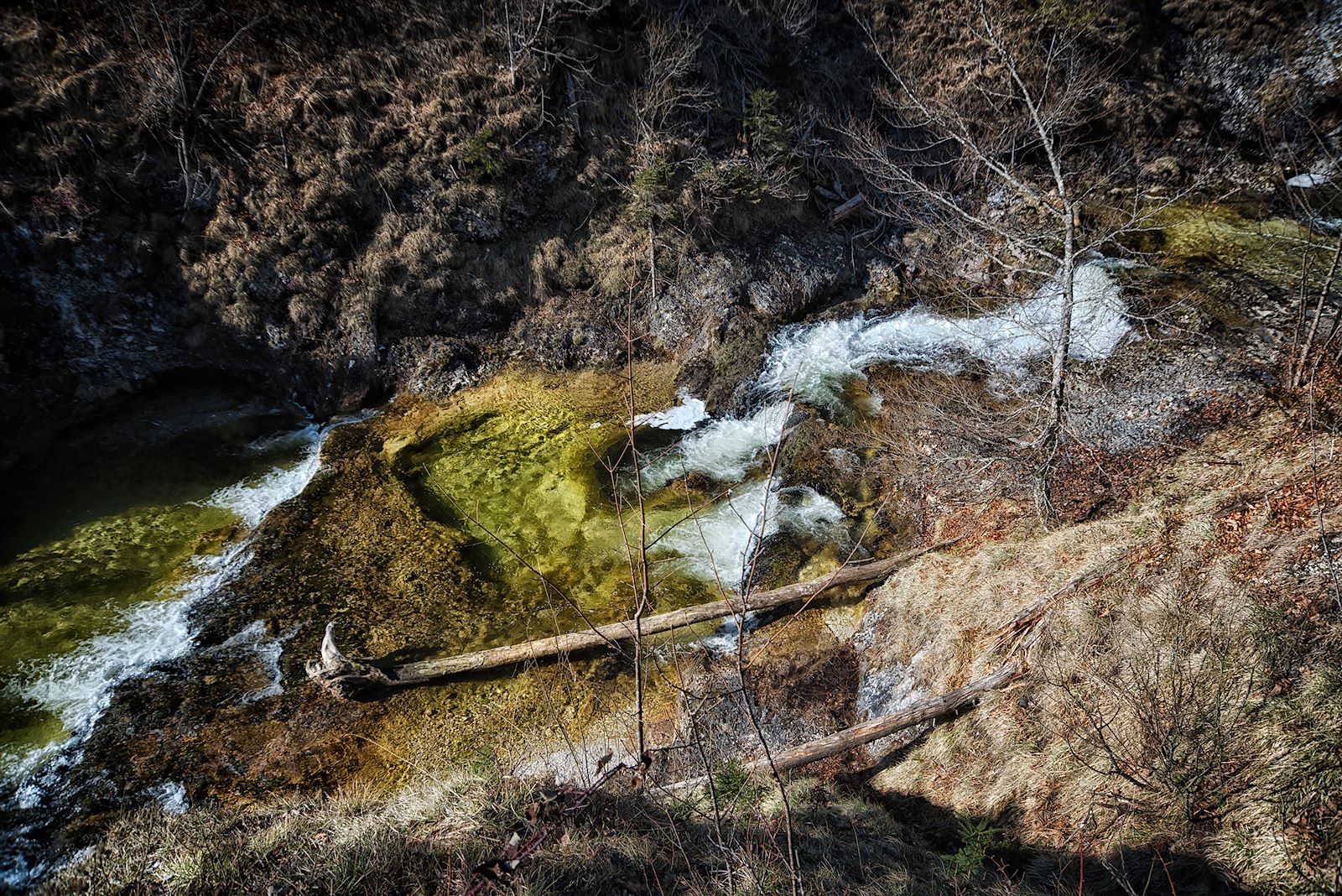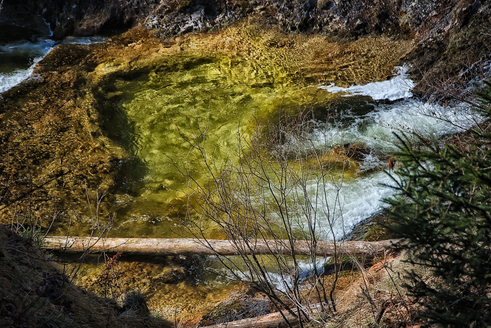 Schon bald kommen die Gimbachkaskaden in Sicht. Der Gimbach entwässert einen Teil des Höllengebirges auf der Südseite. Über mehrere Stufen stürzt das bernsteinfarbene Wasser dem Tal entgegen und mündet sogleich in den Weißenbach. Und es ist eine Menge Wasser. Aha, da ist also das ganze Wasser abgeblieben!