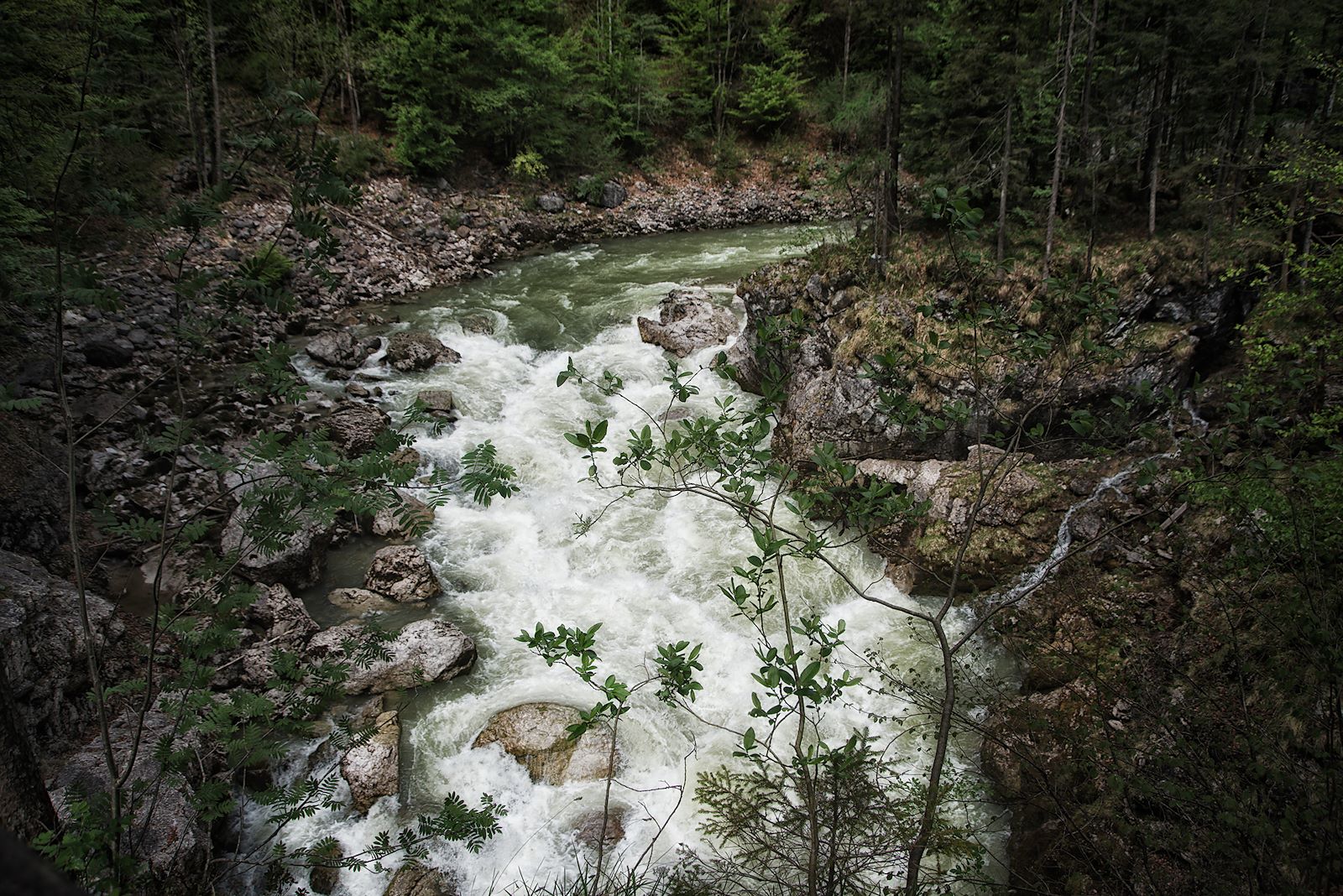 Es ist ein Freitagnachmittag und der Parkplatz bei der Lammerklamm fast leer. Auch an der Kasse sind wir weit und breit die einzigen. Auf mehr als eine Handvoll Menschen sollten wir an diesem Tag nicht treffen. Umso besser, denke ich, denn wann hat man schon die Möglichkeit, die Klamm und ihre schmalen Stege ganz ohne Menschen abzulichten?