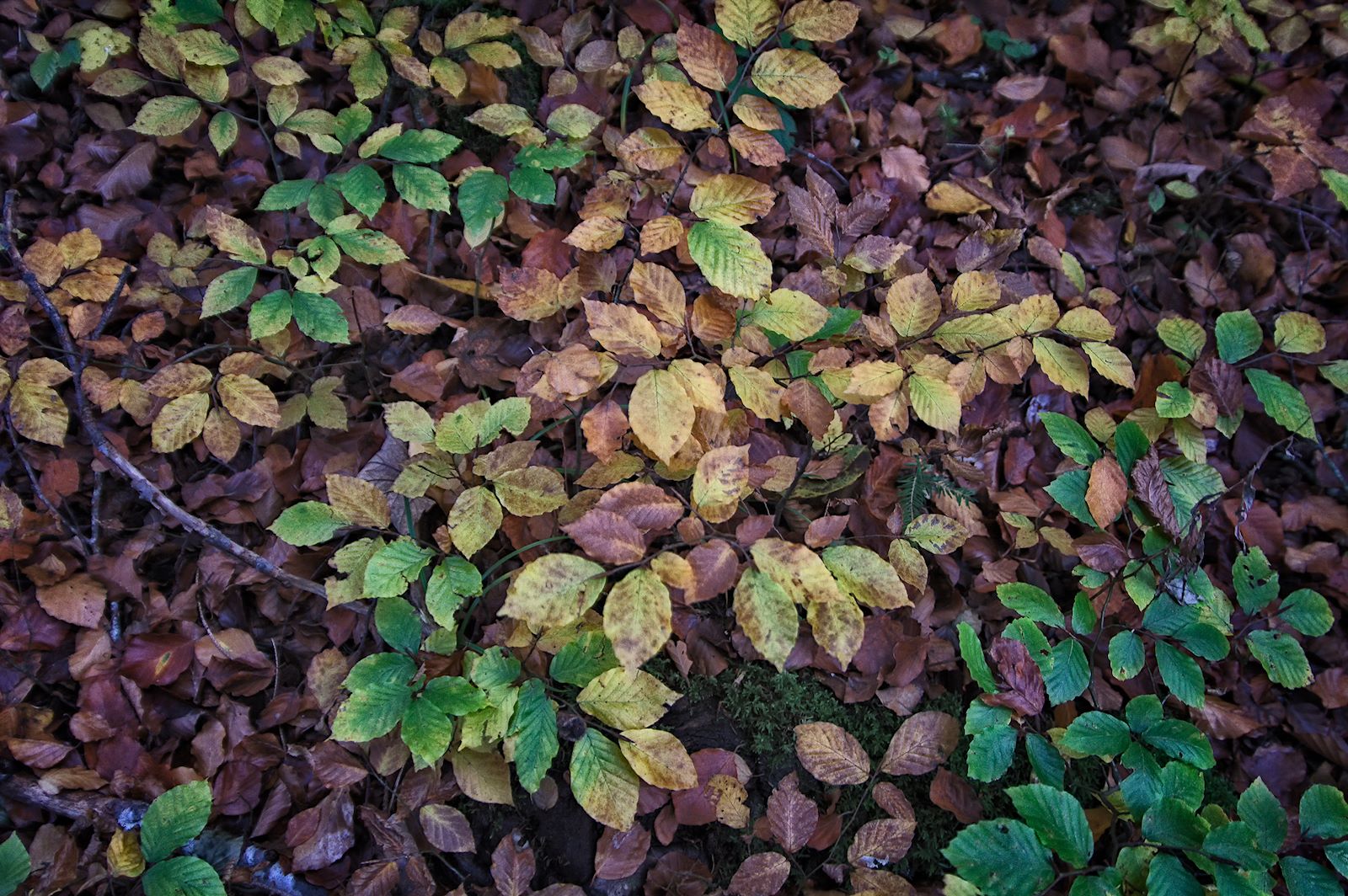 Ok, kann man nun sagen, das mag das Eschentriebsterben sein. Aber es gibt auch andere Beispiele, wie etwa ein Blick auf einen Buchenjungwuchs zeigt: Während manche Exemplare noch komplett grün sind, verfärben sich andere schon deutlich rostrot. Wie ein buntes Mosaik präsentiert sich so der Waldboden.