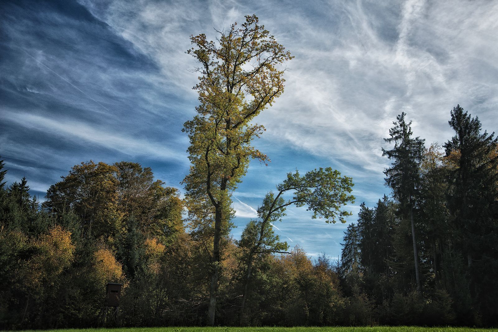 Aber dass die Herbstverfärbung kein gleichmäßiger Prozess ist, können wir sehr gut an ein und demselben Baum beobachten: Niemals verfärbt sich gleich der ganze Baum. Vielmehr existieren alle Stadien der Verfärbung – zumindest noch im Oktober – gleichzeitig.