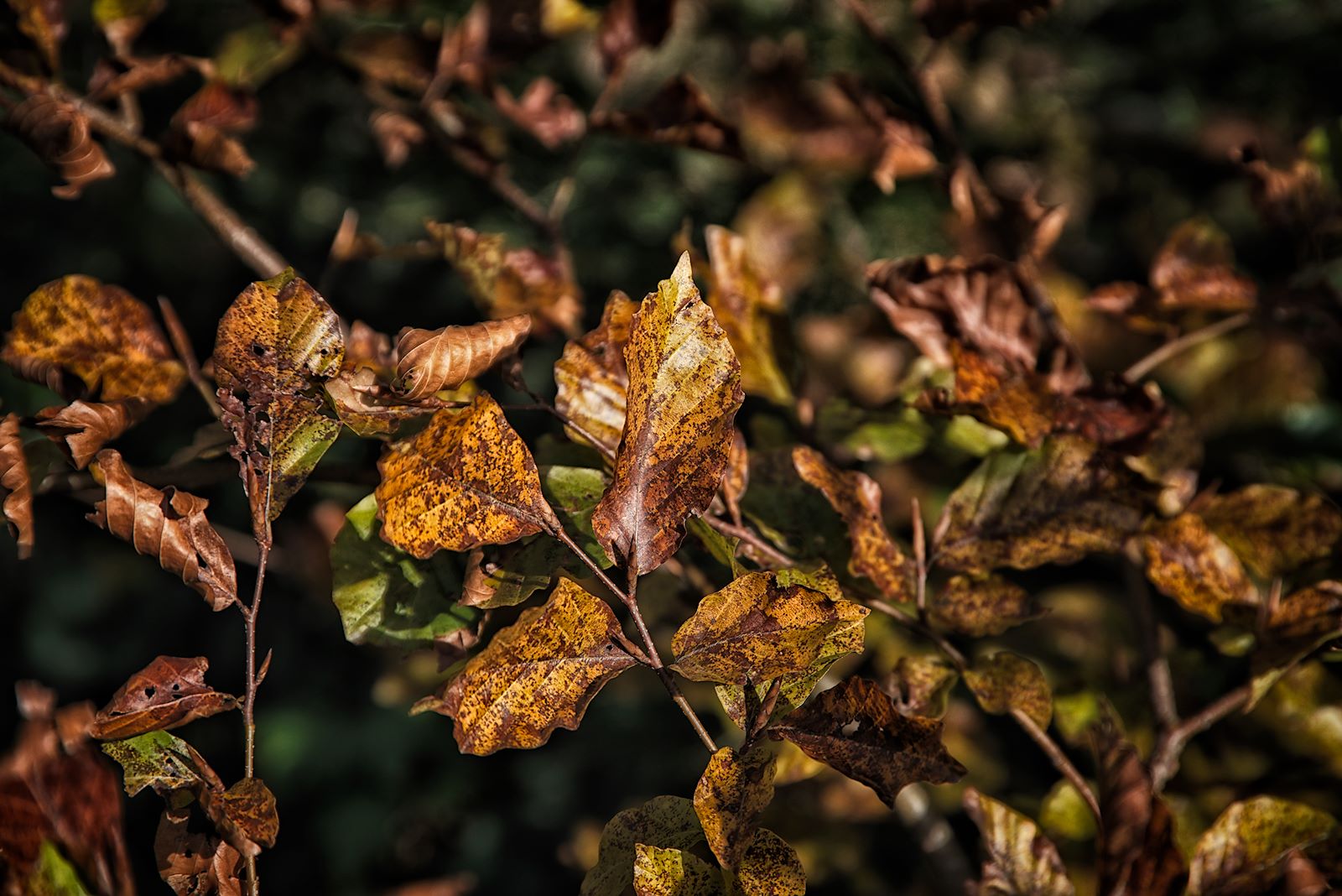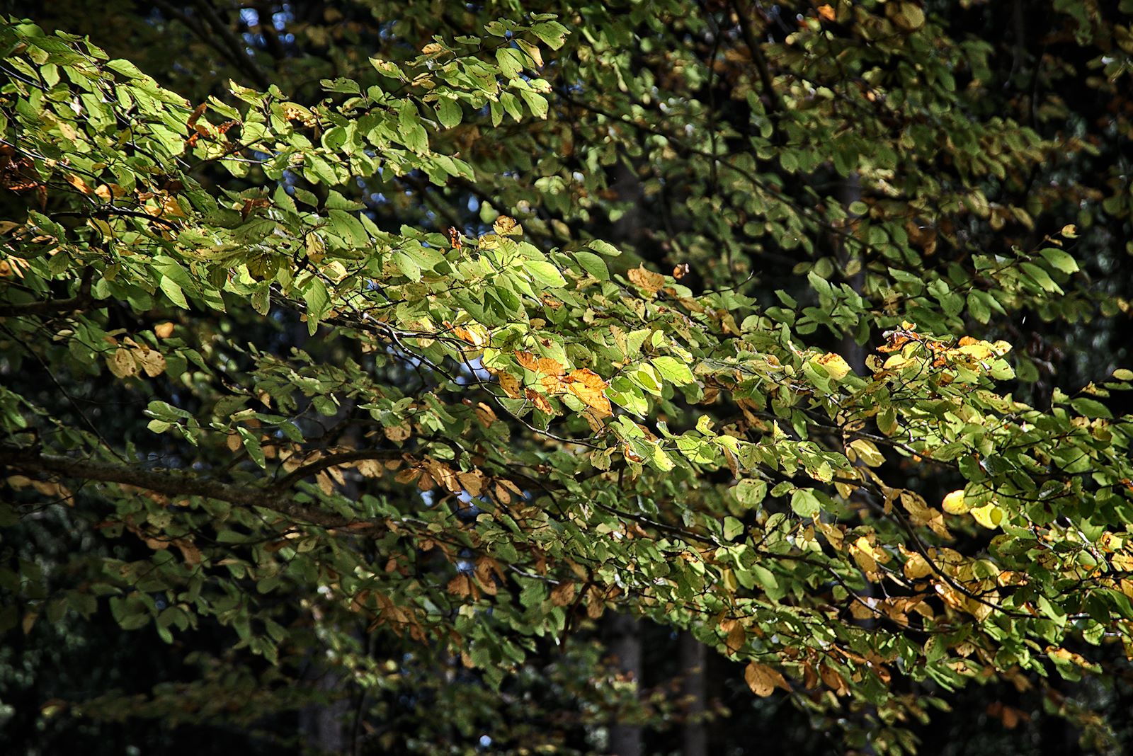Das Foto unten veranschaulicht es ganz gut: Während ein paar Blätter bereits rostrot sind, also im Endstadium der Buchenverfärbung, zeigen andere noch die anfängliche Gelbfärbung. Die allermeisten Blätter sind allerdings noch immer saftig grün, der Baum kann also das Sonnenlicht an diesem wunderschönen Herbsttag noch nutzen, um Zucker zu synthetisieren, den er für den Kraftakt der Blätterneubildung im nächsten Frühjahr sicherlich gut gebrauchen kann.