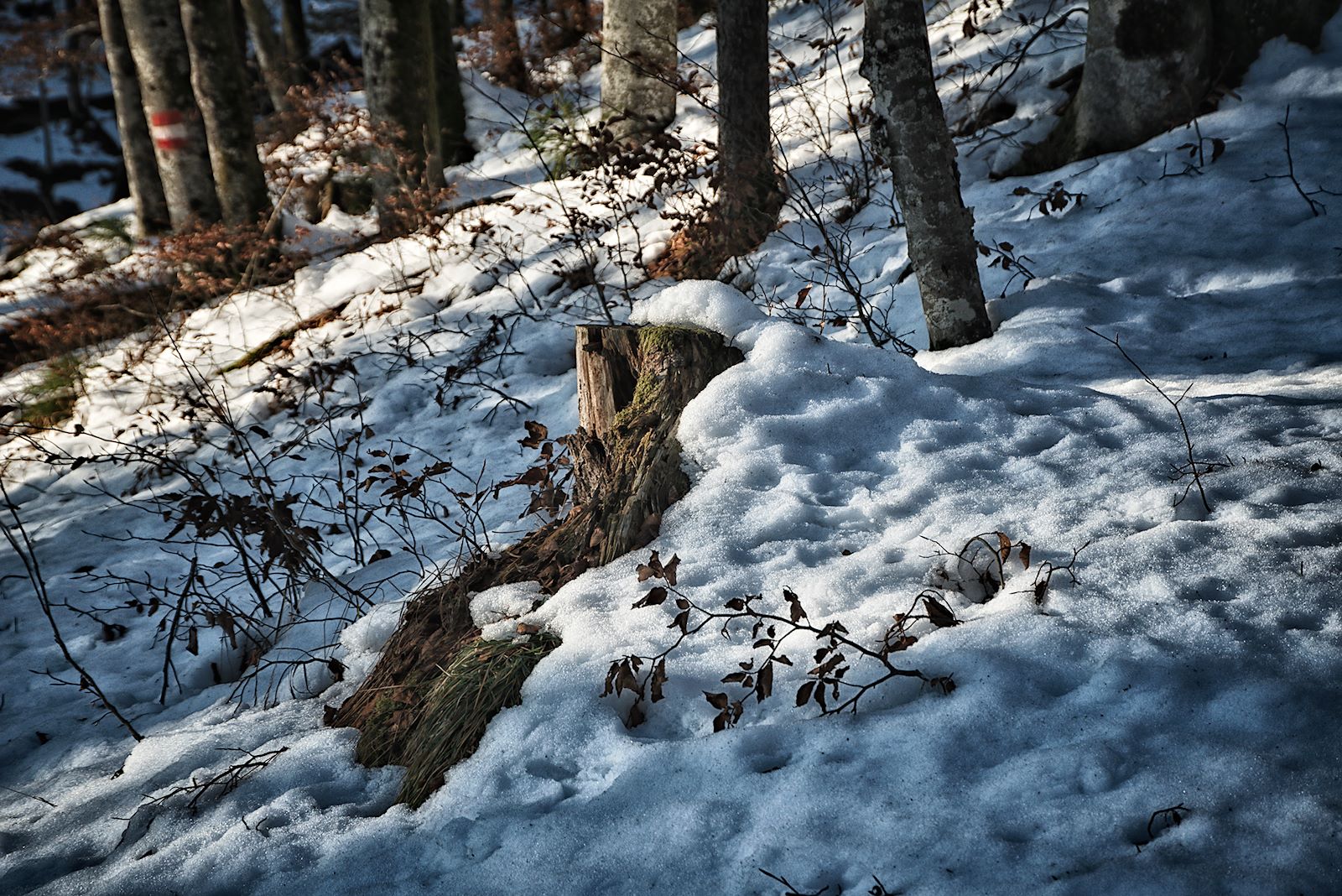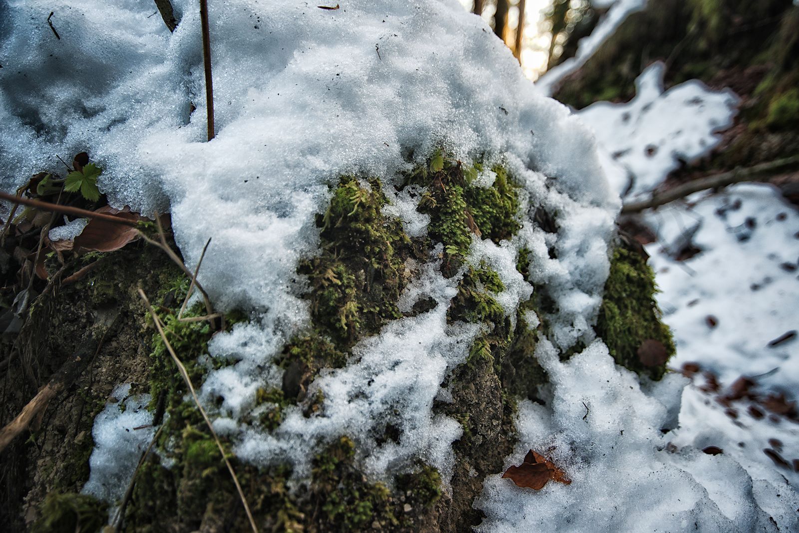 Der Weg führt nun durch den Wald steil hinunter in die Plötz. Auch hier besteht erhöhte Rutschgefahr. Und ihr werdet nicht glauben, was wir Mitte Dezember trotz Eis und Schnee gefunden haben: