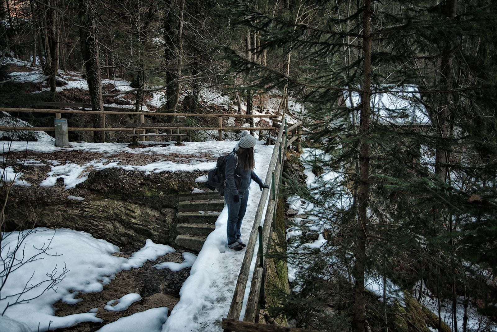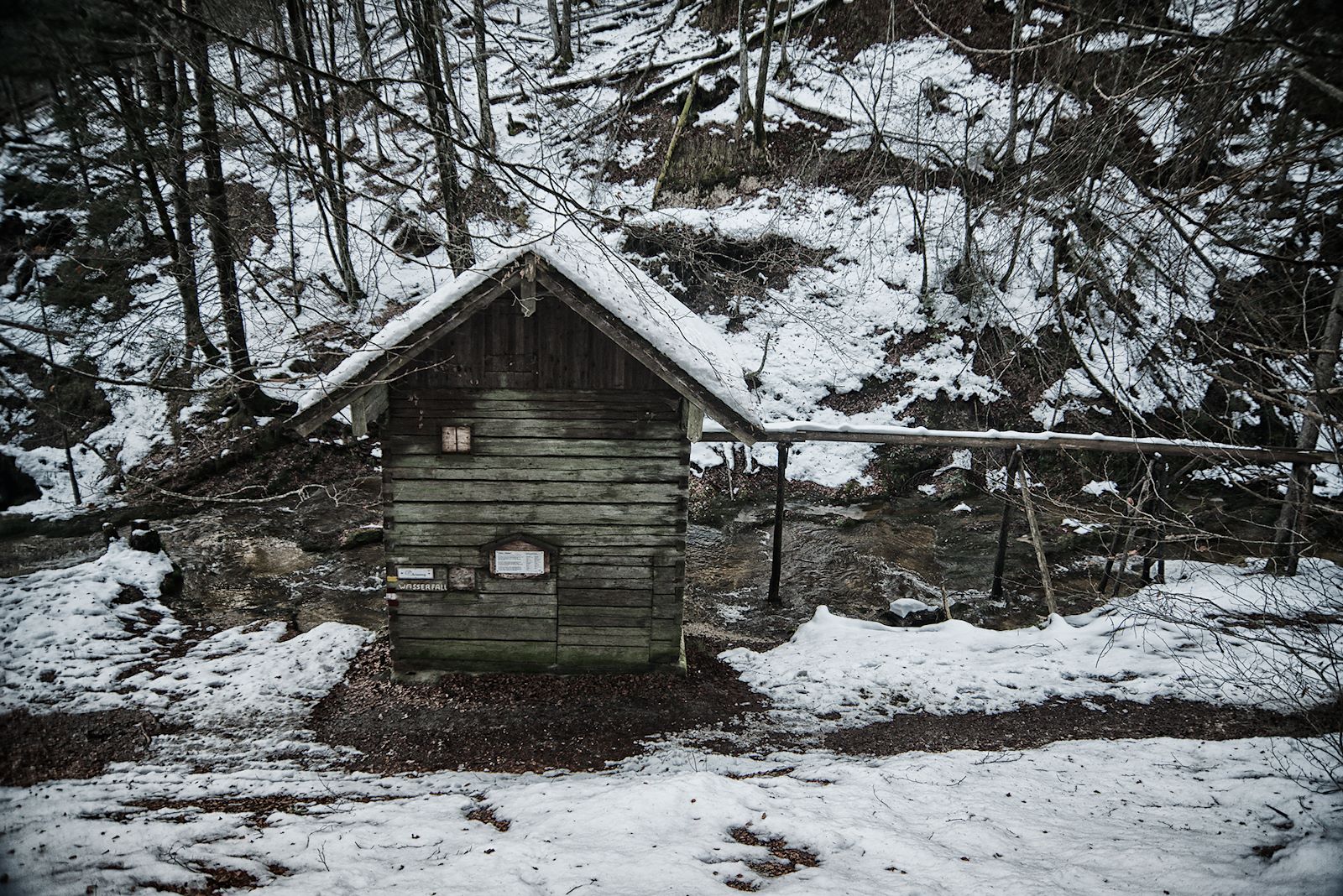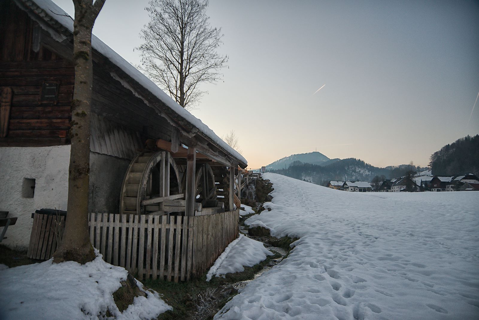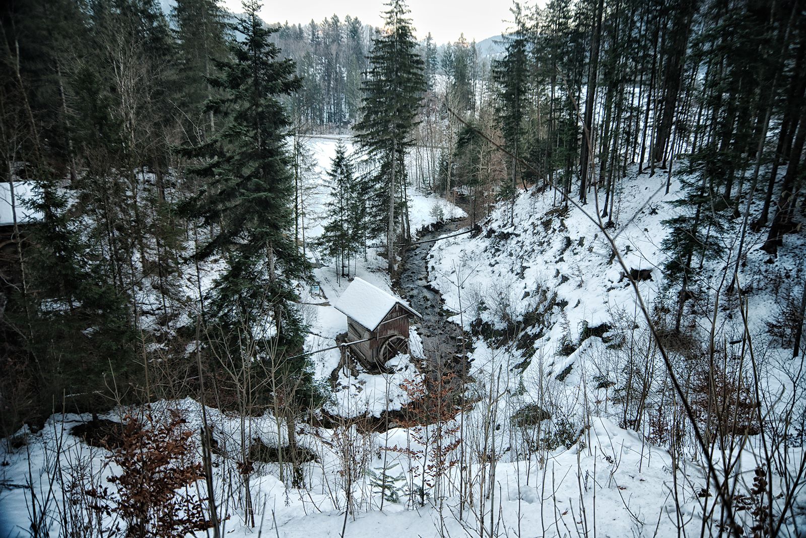 Ein schmaler Steig führt direkt zur Mühle. Auf diesem besteht allerdings Absturzgefahr und bei Schnee rate ich davon ab, hinüber zu gehen.