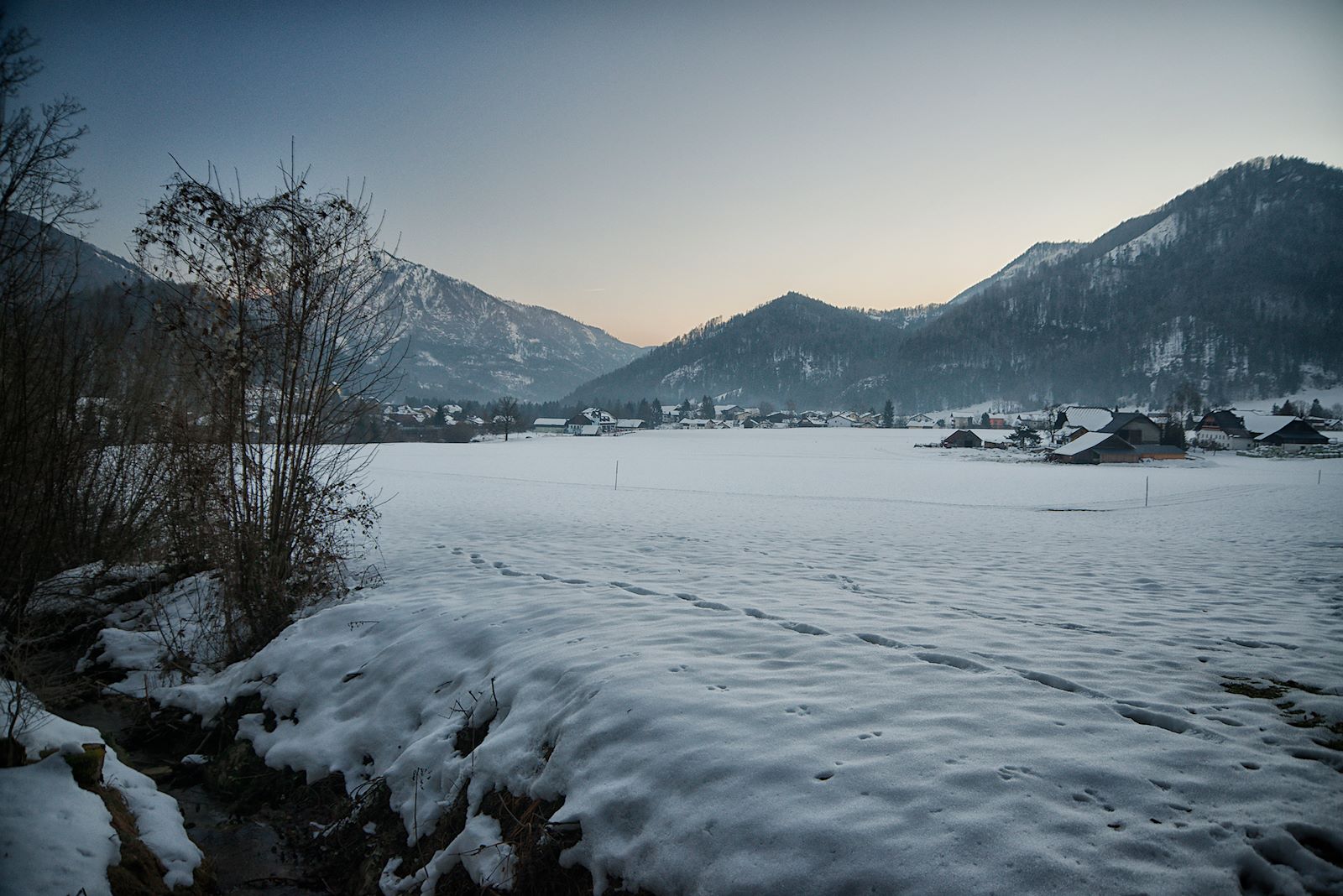 Vorbei an der Kneippanlage, die gerade unter einer Schneedecke ruht, gelangen wir wieder zurück zum Waschlbauern und auf bekanntem Weg entlang der Traktorspur bald auch zum Ausgangspunkt. Dort angelangt ist die Dämmerung bereits eingebrochen, aber das ist ja – wer meine Touren so mitverfolgt – ganz normal. 😉