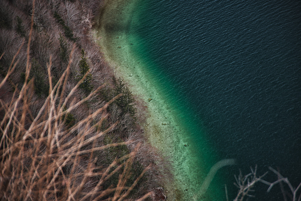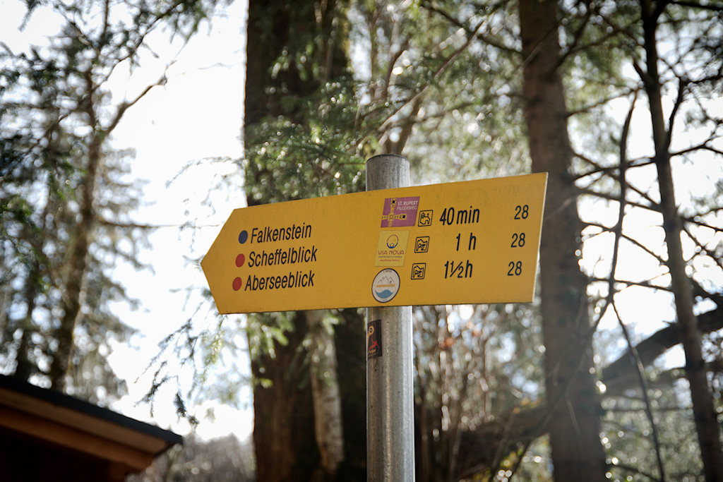 Als wäre es ein Relikt aus einer anderen Welt, treffen wir in einer dieser Felsrinnen auf einen Wegweiser. Er weist uns aus der Rinne nach rechts hinaus, rauf auf eine Kuppe. Bald öffnet sich der Wald vor uns und wir stehen auf einer Sonnenterrasse hoch über dem Wolfgangsee und vis-à-vis dem Zwölferhorn, das sich an der Wasseroberfläche spiegelt. Unter uns fällt die vom gegenüberliegenden Ufer weithin sichtbare Falkensteinwand annähernd senkrecht 200 Meter tief zum Wolfgangsee ab und beschert diesem eines seiner markantesten Erkennungsmerkmale.