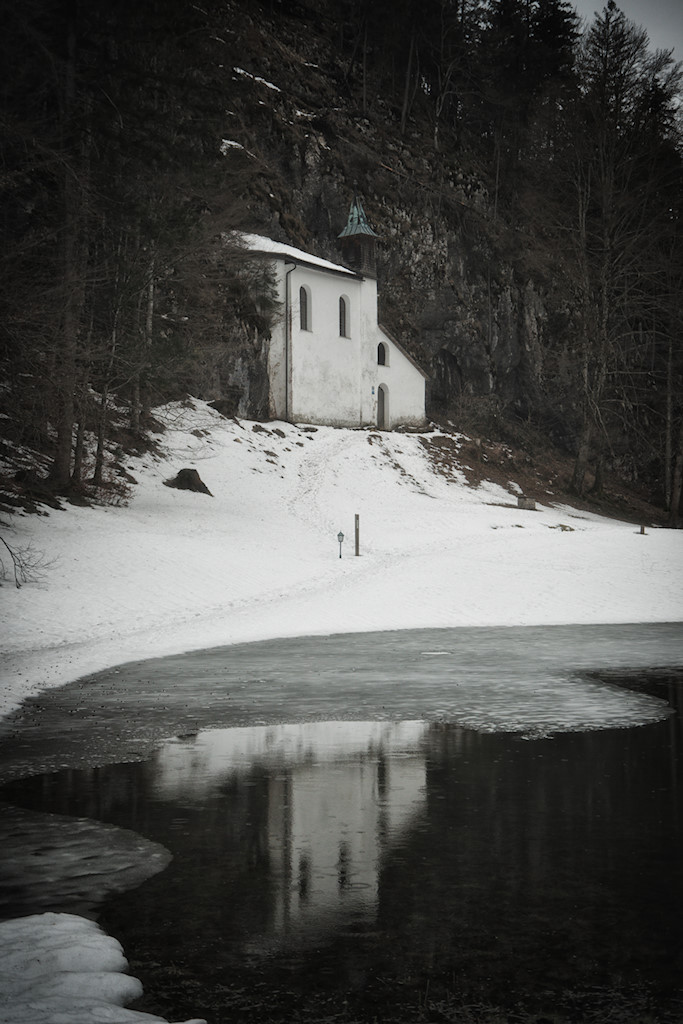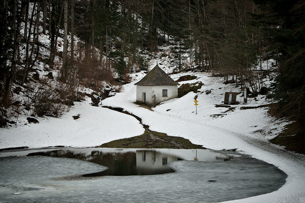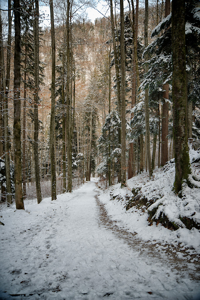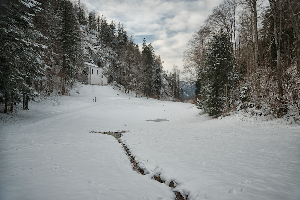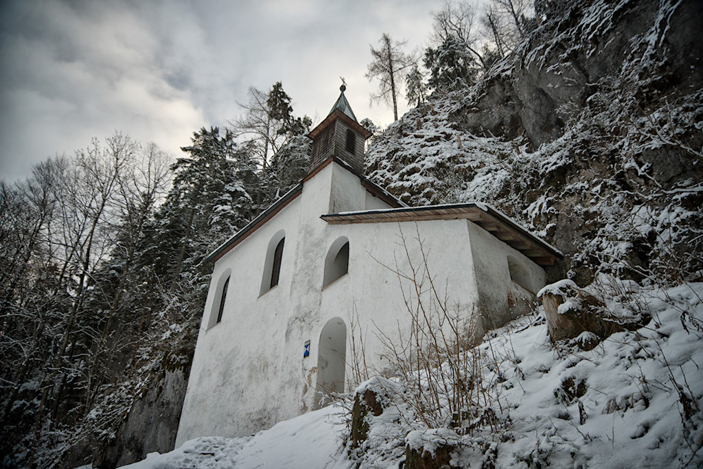 Wir befinden uns auf dem uralten Pilgerweg nach St. Wolfgang. Der Abschnitt bis zur Falkensteinkirche ist als Kreuzweg angelegt. Bald führt unser Weg entlang eines Bachlaufes steil bergauf und kann bei entsprechender Schneebeschaffenheit (zusammengetreten, angetaut und wieder überfroren) zur Rutschpartie werden, vor allem bergab auf dem Rückweg. Dann bleibt oft nur noch abseits des Weges besseren Halt zu suchen. Beim letzten Mal hatten wir diese Situation, heute hingegen ist der Schnee relativ griffig und wir kommen gut voran.