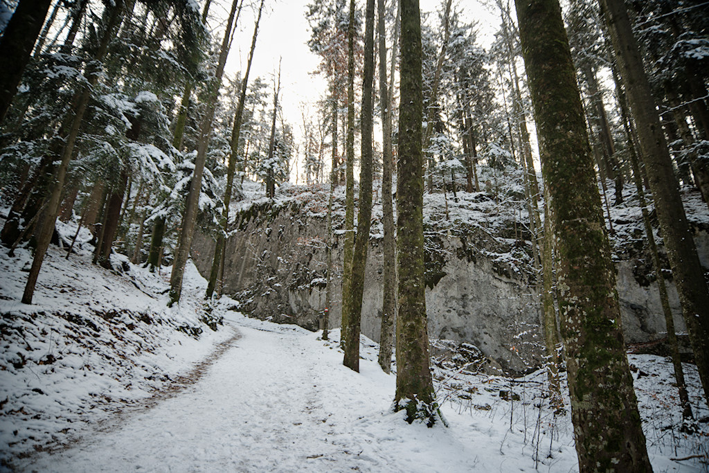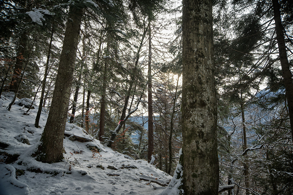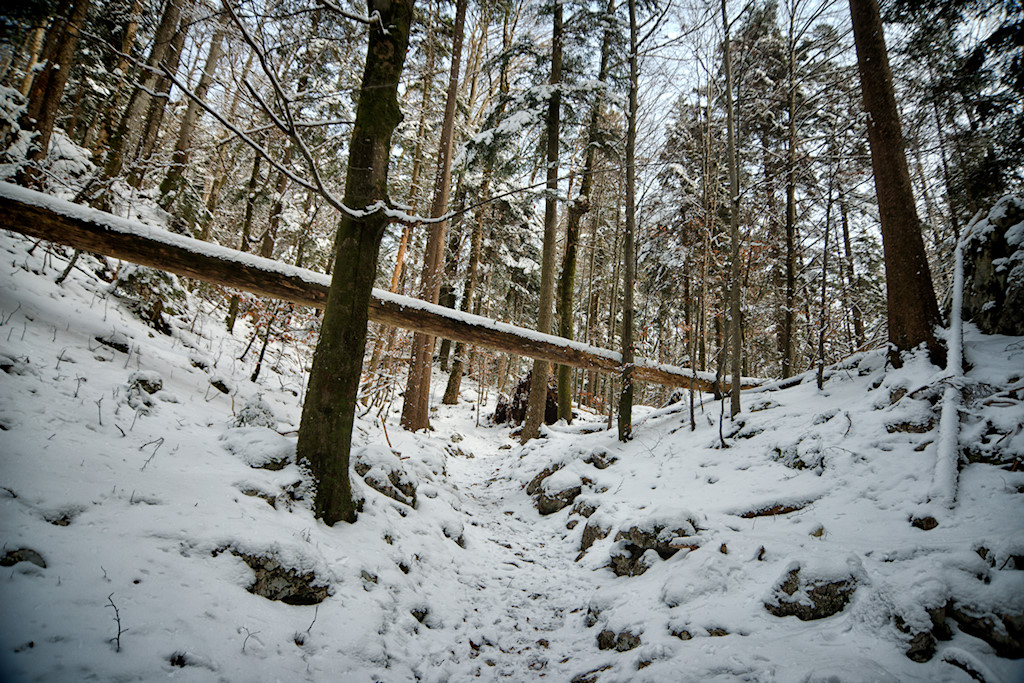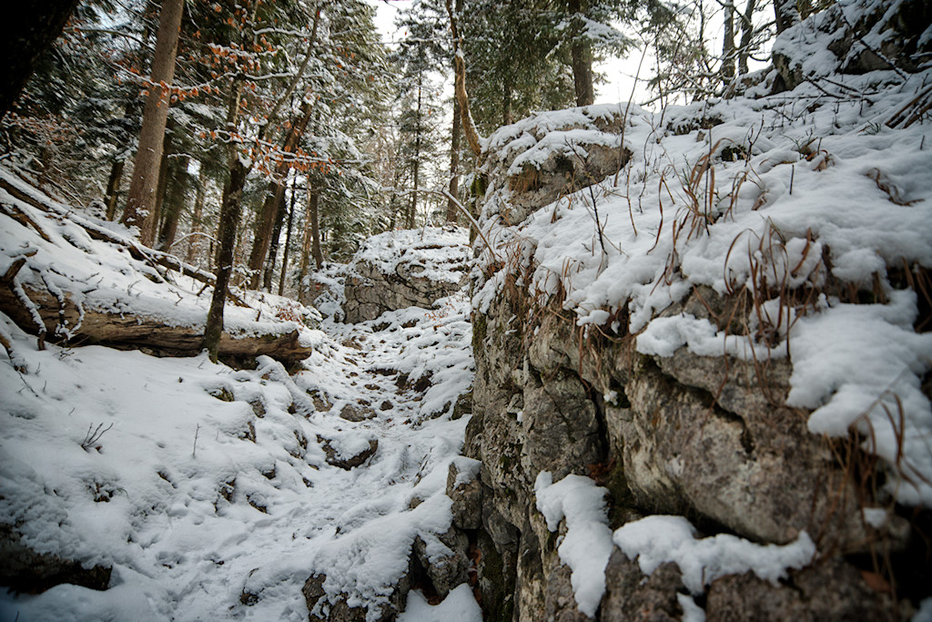 Es ist einer dieser Wege, die richtig Spaß machen: Mal geht es rauf, dann wieder hinunter. Über Stock und über Stein führt der Steig durch Felsrinnen hindurch und an quer liegenden Bäumen vorbei. Auch hier kann es stellenweise etwas vereist sein. Nicht nur deshalb will jeder Schritt ganz bewusst gesetzt werden.