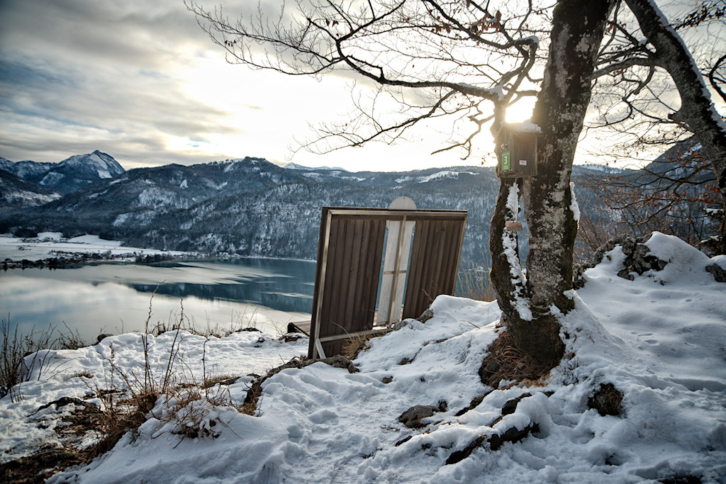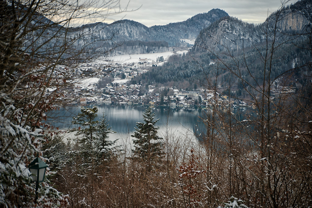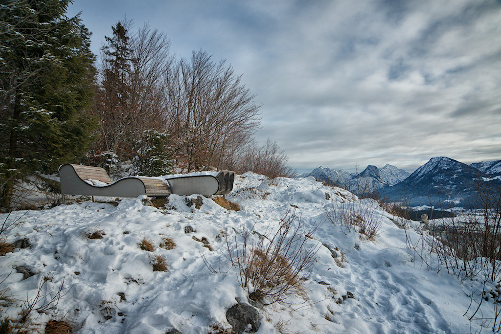 Jedenfalls ist es der ideale Pausenplatz. Holzliegen laden zur Entspannung ein, wenn sie nicht gerade schneebedeckt sind. Folgt man dem Steig weiter, so gelangt man durch lichten Wald bald zum nächsten Aussichtsplatz, von dem aus sich der östliche Teil des Wolfgangsees überblicken lässt. Hier kann man auch erfahren, warum der Ort Scheffelblick heißt.