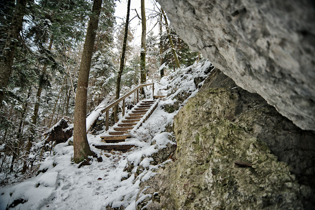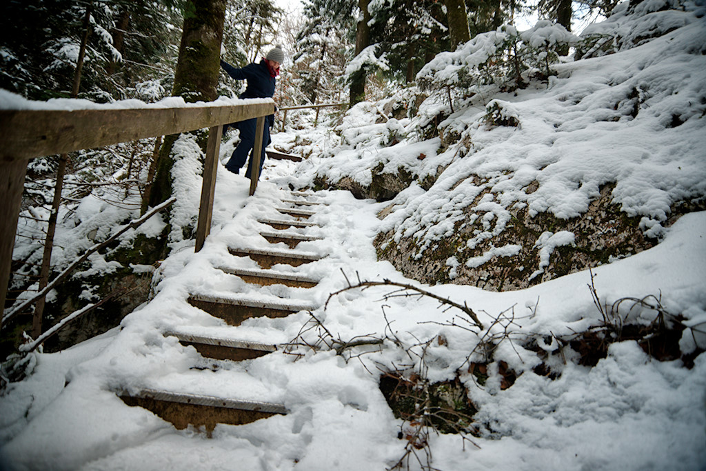 Nun folgen einige Holztreppen, die wiederum teilweise vereist sind und deshalb ein Mindestmaß an Trittsicherheit erfordern. Die letzte dieser Treppen führt unterhalb eines gewaltigen Felsblockes vorbei, auf dem eine abgestorbene Fichte bedrohlich über dem Abgrund hängt.