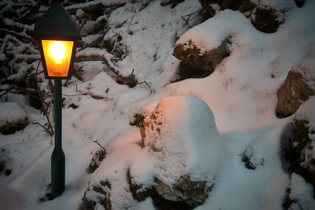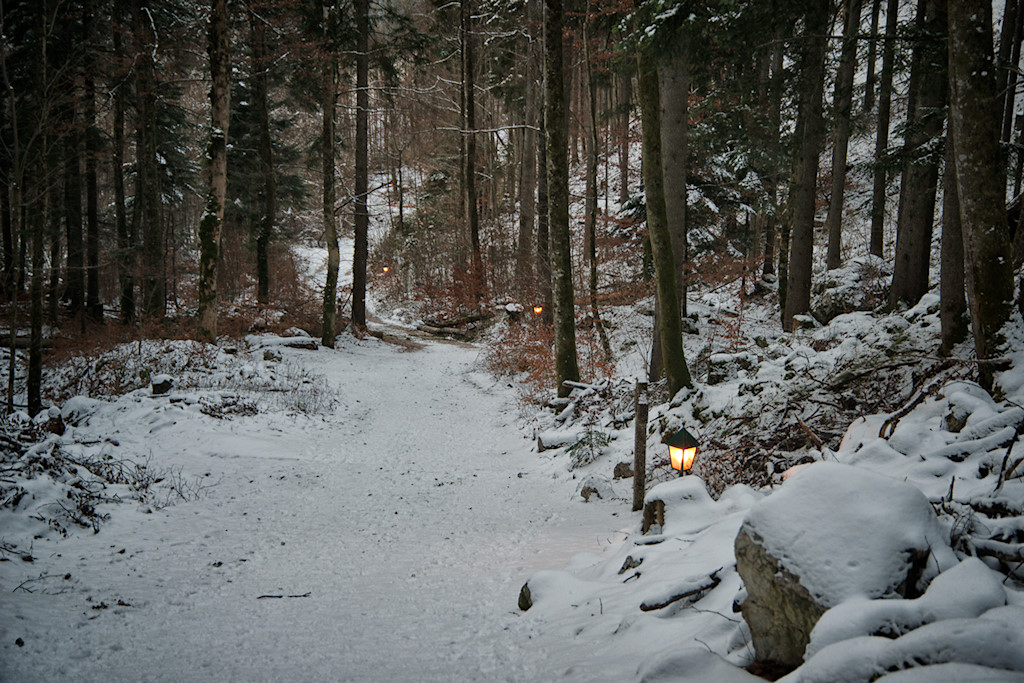Langsam bricht die Dämmerung herein und lässt uns ein weiteres Highlight erleben: Der Kreuzweg ist im Dunkeln beleuchtet. Die Laternen tauchen den Schnee in ein warmes, orangefarbenes Licht, was auf den Fotos allerdings nur ansatzweise rüberkommt.