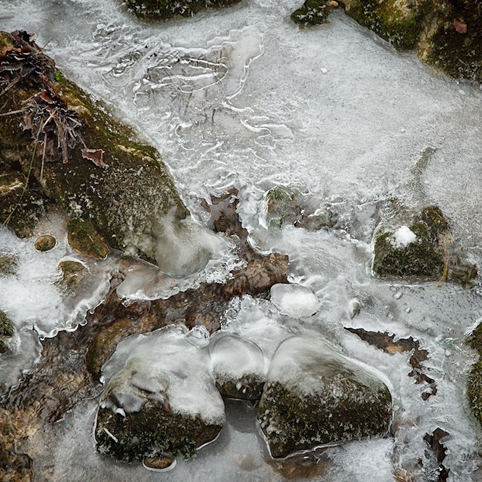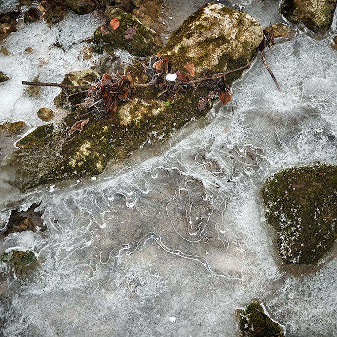 Obwohl wir uns weiterhin auf einer Asphaltstraße befinden, führt sie uns sehr idyllisch an einem Bach entlang durch einen kleinen Graben. Der Frost hat hier fantastische Skulpturen aus Eis entstehen lassen: