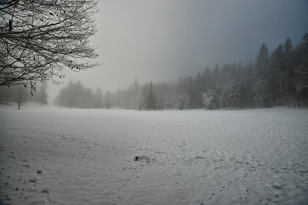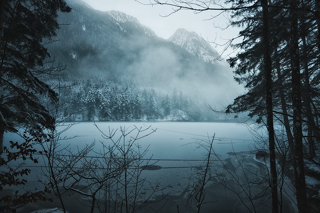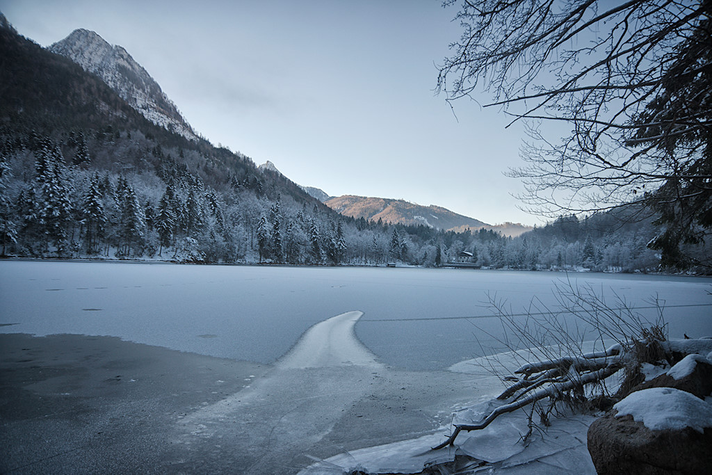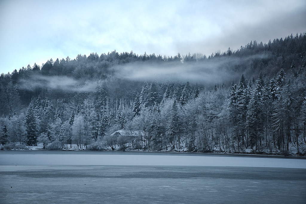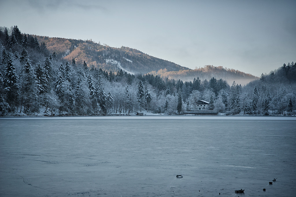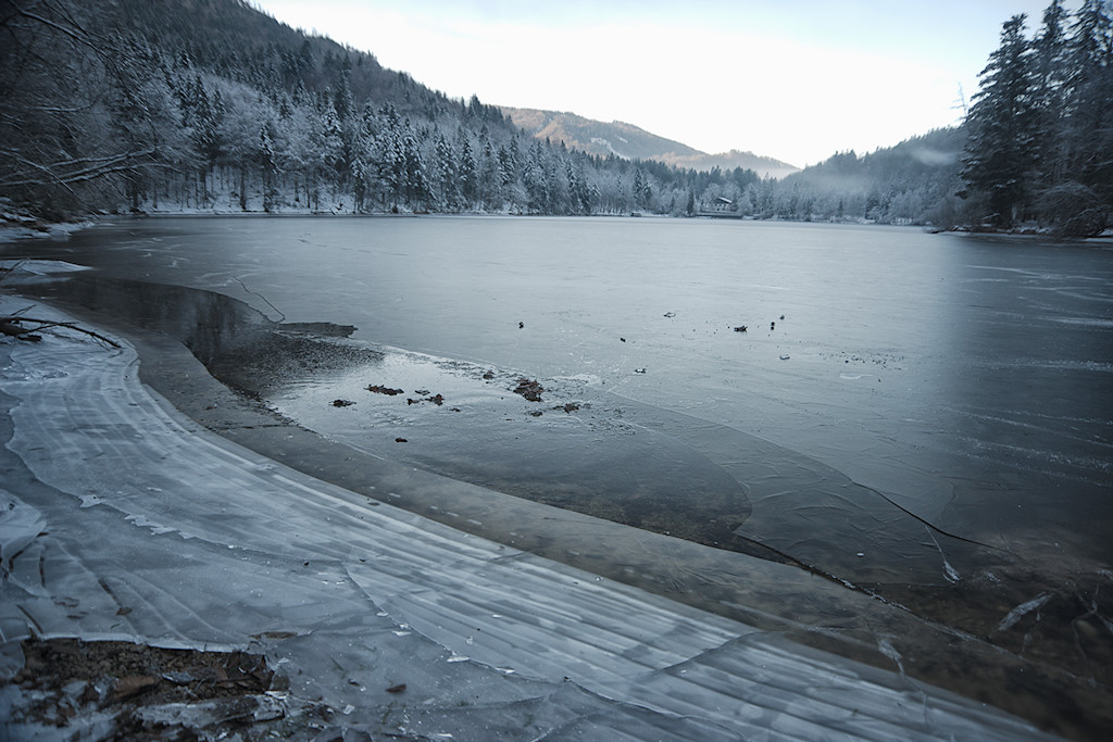 Heute sind wir ausnahmsweise einmal etwas früher unterwegs und auf der Hinfahrt male ich mir schon die tollsten Motive aus, wenn später die Sonne durch die Nebeldecke brechen wird. Doch aus strahlend blauem Himmel und wärmenden Sonnenstrahlen sollte dieses Mal nichts werden. Das war aber auch nicht zu erwarten, denn der Nussensee liegt am nördlichen Fuße des Katergebirges und somit von November bis Februar im Dauerschatten.