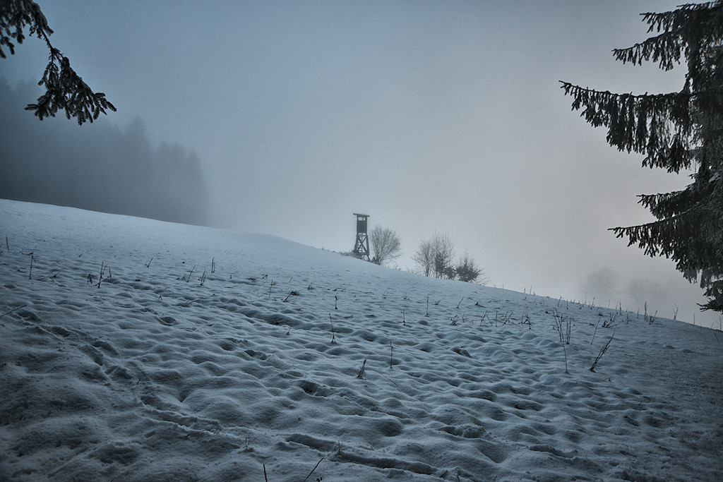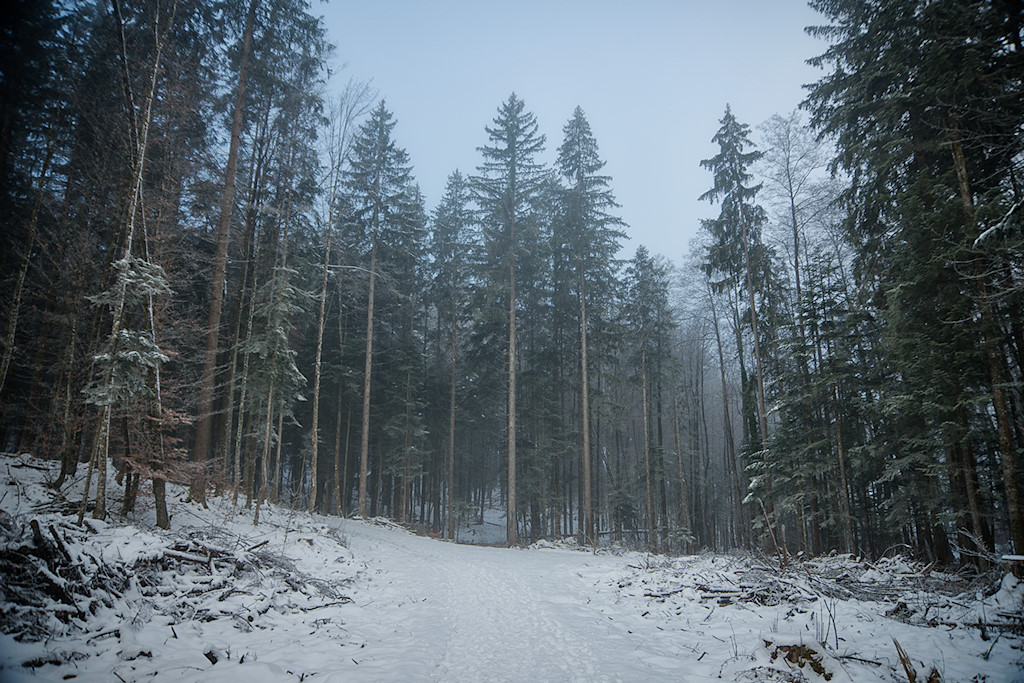 Kurz darauf ist das letzte Gehöft erreicht, der Asphalt zu Ende und unser Weg führt als Forstweg in den Wald. Interessanterweise geht es zunächst leicht bergab, bis das Gelände kurz darauf vor uns anzusteigen beginnt. Der Forstweg geht über in einen Waldweg und führt uns bald an einer Lichtung vorbei, von der aus man bestimmt einen wunderbaren Ausblick hat, wenn es nicht gerade nebelig ist.