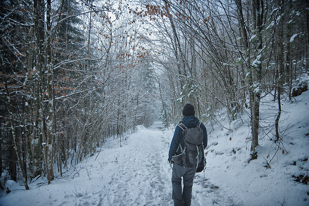 Wegbeschaffenheit: Wanderung auf Straßen, schneebedeckten Forst- und Waldwegen, sowie auf schmalen Steigen