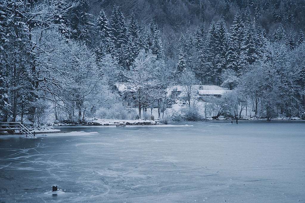 Der See ist keineswegs überlaufen, aber auf eine Handvoll Wanderer und Schlittschuhläufer treffen wir schon. Dies liegt vor allem daran, dass man auch bequem mit dem Auto zufahren kann. Am westlichen Ende des etwa 600 Meter langen und maximal 250 Meter breiten Sees stoßen wir auf diese Straße und folgen ihr nach rechts, nicht aber ohne die Gelegenheit genützt zu haben, nochmals auf einen Sprung hinunter zur Wasserfläche zu schauen. Dort konnte ich mich auch gleich selbst von der Tragfähigkeit der Eisdecke überzeugen.