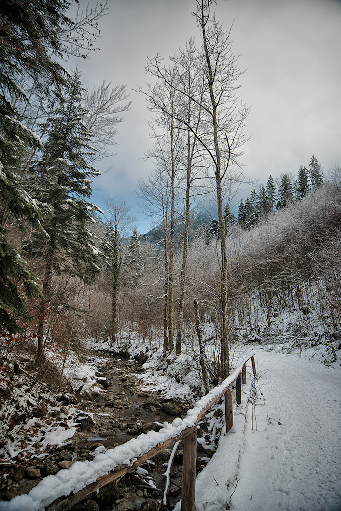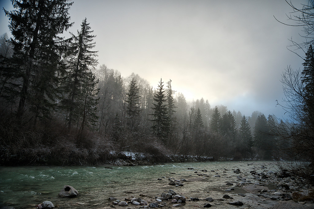 Die Ischl entwässert den Wolfgangsee und mündet in Bad Ischl in die Traun. Ersteres sieht man ihr auch sofort an: Ihre kräftig grüne Farbe, dieselbe, die auch den Wolfgangsee schmückt, verleiht der tristen winterlichen Nebellandschaft einen kräftigen Farbklecks. Die Farbe stammt übrigens von Mineralien, die vom Wasser aus dem Kalkgestein gelöst wurden und ist typisch für viele Gewässer der nördlichen Kalkalpen.