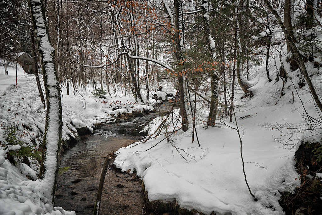 Vorbei am tief verschneiten Kräutergarten und der Rumingmühle führt der Weg am Ellmaubach entlang durch den Wald. Der Schnee und das dunkle Bachbett geben einen sehr starken Kontrast.