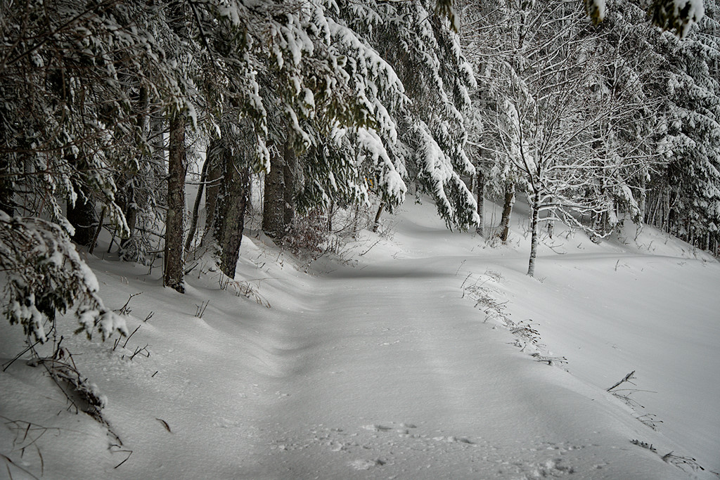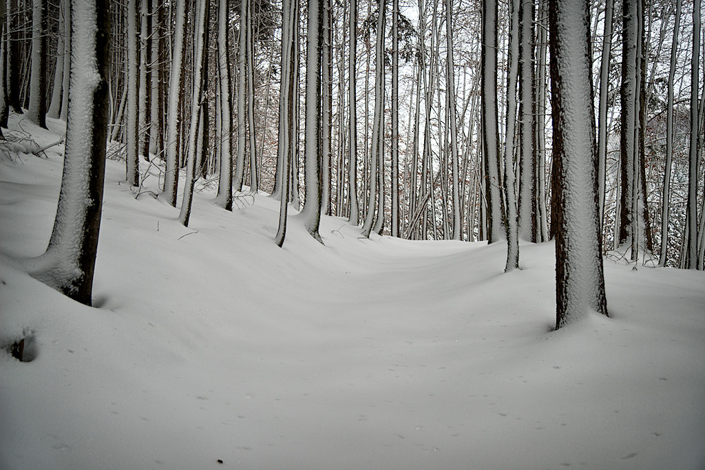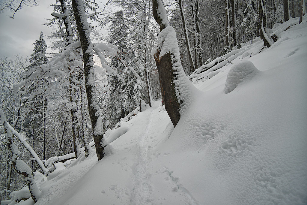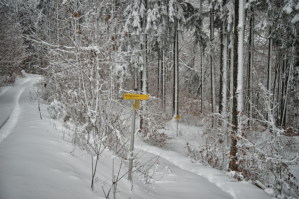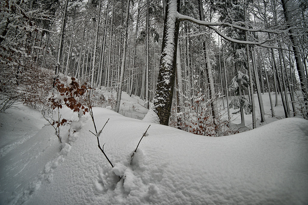 Nach gerade einmal 300 Metern zweigt der Wanderweg wieder nach links in den Wald ab. Doch nun beginnt die Herausforderung: Abgesehen vom Wegweiser deutet absolut nichts darauf hin, dass hier ein Weg sein könnte. Trotzdem wagen wir uns in den Tiefschnee. Schließlich wollen wir ja auch ein kleines Abenteuer erleben. Gut nur, dass uns der Wegverlauf bekannt ist, ansonsten wäre unser Vorhaben von Anfang an zum Scheitern verurteilt. Und so geht es Schritt für Schritt durch den meist kniehohen Schnee, der an wenigen geschützten Stellen auch mal nur bis zu den Knöcheln reicht. Aber die wunderbare, von Menschen völlig unberührte Schneelandschaft und die zahlreichen Tierspuren, die es zu lesen gilt, entschädigen allemal für die Strapazen.