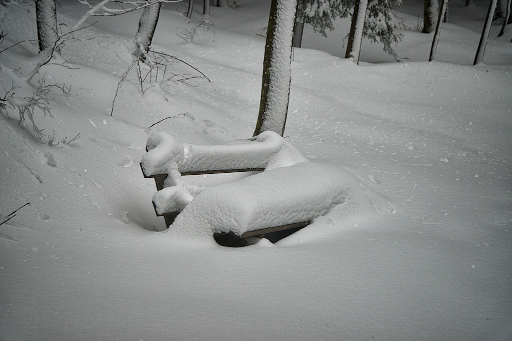 Unser Ziel, der Mozartblick, ist zwar nur noch mit fünfzehn Minuten ausgeschildert, doch es dauert eine gefühlte Ewigkeit uns durch den Schnee zu kämpfen. Hier heroben dürfte der Wind den Schnee nochmals kräftig zusammengeschoben haben, denn plötzlich stecken wir sogar teilweise bis zu den Oberschenkeln in weißem Pulver. Nach 150 Metern stößt ein weiterer Wanderweg vom Hochlackenhof zu unserem Weg dazu. Diesen werden wir dann am Rückweg folgen. Ab hier haben wir das Privileg, wieder einer menschlichen Spur folgen zu können. Wer immer in die Fußstapfen anderer tritt, wird zwar bekanntlich nie seinen eigenen Weg gehen können, doch nach dem Kampf gegen den Tiefschnee, fühlen sich die Fußstapfen eines vorausgegangenen Wanderers wie eine kleine Erlösung an.