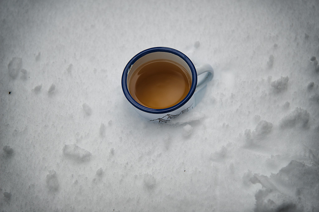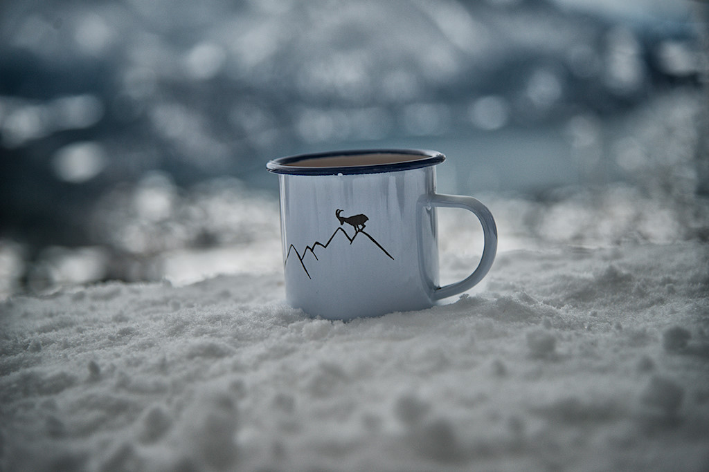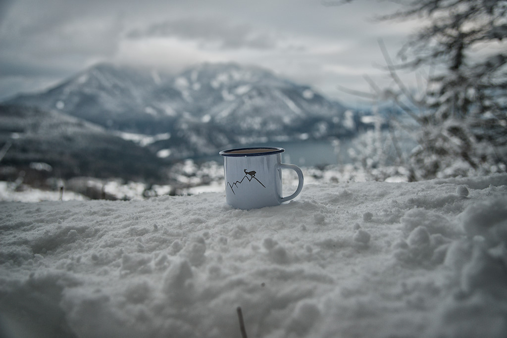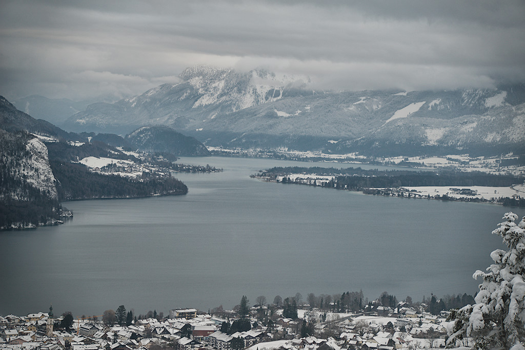 Am Mozartblick schließlich angekommen, haben wir uns erstmal eine Pause mit Tee und heißer Suppe verdient. Obwohl der Himmel nach wie vor trüb ist, ist die Aussicht immer wieder atemberaubend. Der Wolfgangsee in seiner ganzen Länge liegt uns zu Füßen. Eine wahrlich besondere Perspektive. Ein Blick auf die Uhr überrascht uns dann: Es ist schon fast fünf und die Dämmerung bricht bereits herein. Offensichtlich ist die Zeit irgendwo im Tiefschnee verloren gegangen.
