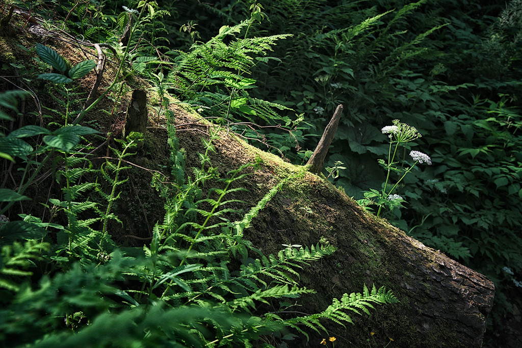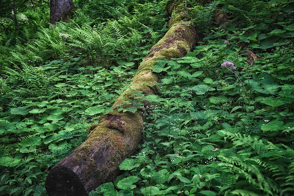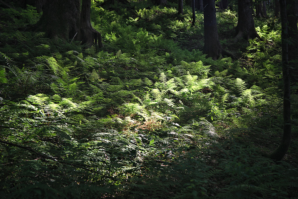 Wir gelangen abermals zur Straße, allerdings nur um diese zu queren und in die Stichstraße gegenüber einzubiegen. Auf dieser bleiben wir allerdings nicht, sondern zweigen sogleich in einen kleinen, steinigen Karrenweg nach rechts in den Wald ab. Keine Sorge, alle Abzweigungen sind beschildert! Hinter dem kurzen Waldstück gelangen wir auf eine alte Kahlschlagfläche, die drauf und dran ist, wieder zu verbuschen. Weiden und junger Bergahorn schießen bereits über Kopf hoch auf, dazwischen bedeckt üppiges Grün jeden Millimeter an Boden. Zwischen Brombeeren, Brennnesseln, Rossminze und anderen Kräutern schlängelt sich der Weg durch das Dickicht. Es ist die vermutlich heißeste Passage dieser Wanderung. Die Sonne knallt erbarmungslos vom Himmel und lässt uns sehr eindringlich spüren, wie wertvoll Bäume und Wald für unser klimatisches Wohlbefinden sind.