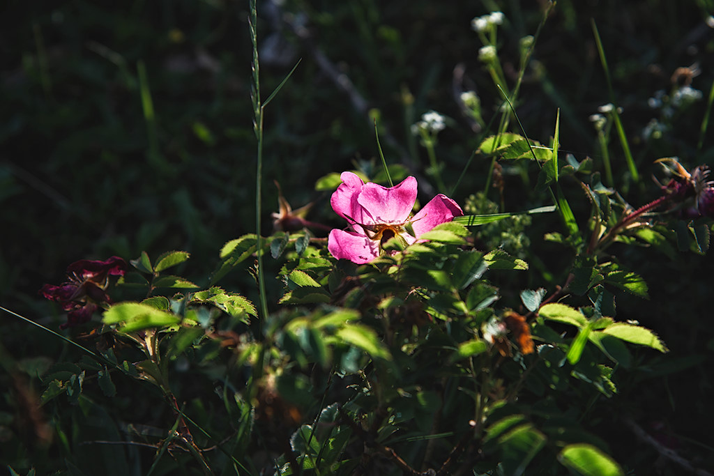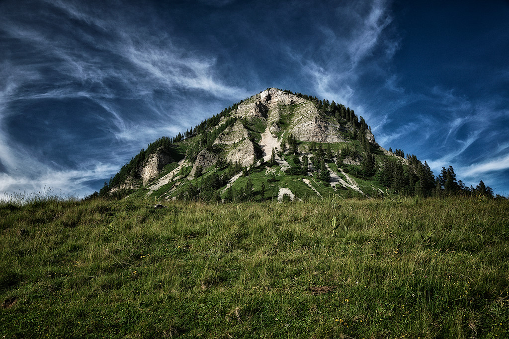 Dann erreichen wir den Waldrand. An einer freistehenden Lärche verlassen wir schließlich den Waldbereich. Hier befinden wir uns bereits im Randbereich der Alm. Parallel zur Straße verläuft nun der Steig über die Almwiese, vorbei an Orchideen, blühenden Rosen und vielen anderen Kräutern. Zu unserer Rechten ragt das mächtige Gennerhorn (1.734 m) auf, vor uns kommt bereits die sanfte Almlandschaft mit dem darüber thronenden schroffen Holzeck (1.603 m) in Sicht.