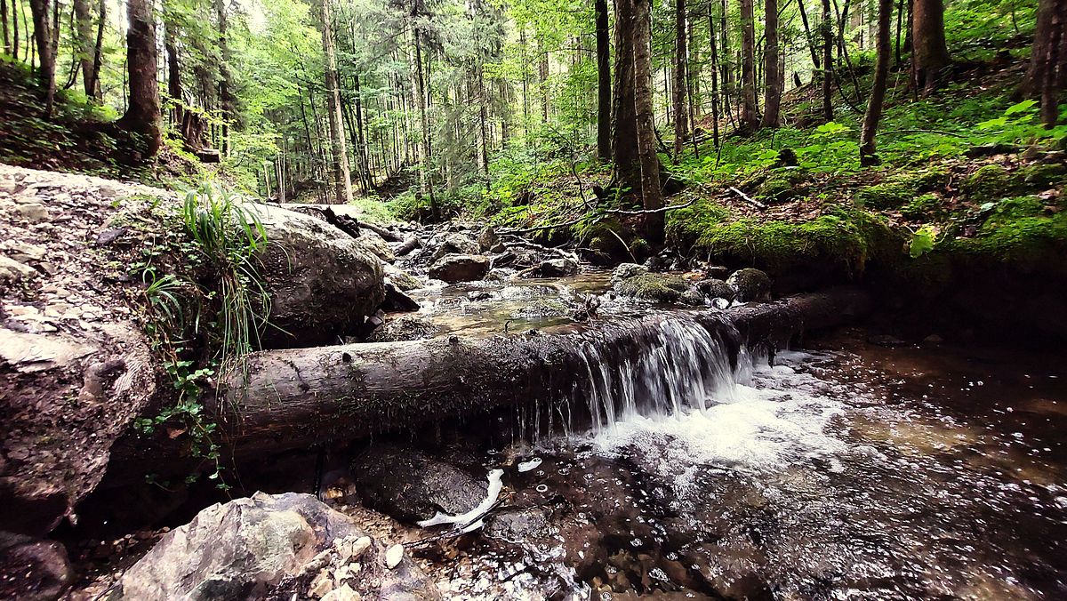 Die Höhenmeter werden auf den ersten beiden Dritteln des Weges entlang des Frillenseebachs zurück gelegt. Erst auf einem Wald- später auf einem breiten, gewalzten Spazierweg, geht es teilweise recht idyllisch durch Bergmischwald. Dann gelangen wir an eine Kreuzung, wo wir der Beschilderung folgend den Forstweg halb rechts nehmen. Dieser bringt uns praktisch ohne weitere Höhenmeter zum See und um diesen herum. Bald passieren wir die nicht mehr bewirtschaftete Gaßlalm, wandern vorbei an einer Trinkwasserquelle und erreichen gleich darauf den Frillensee.