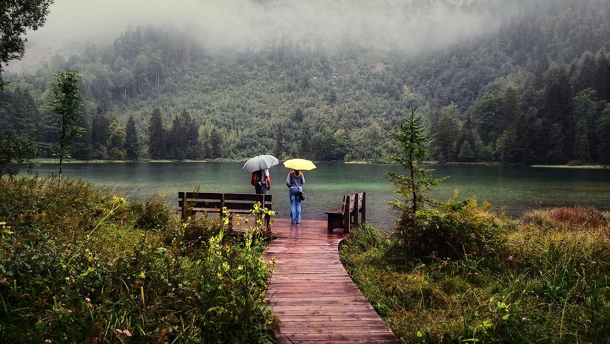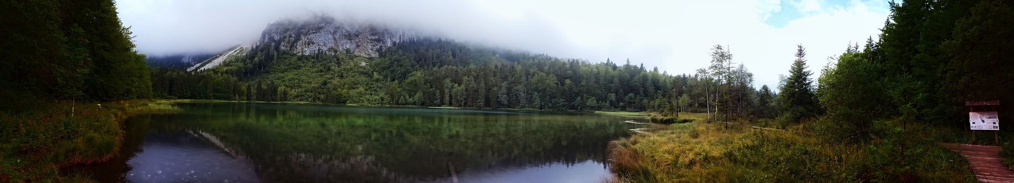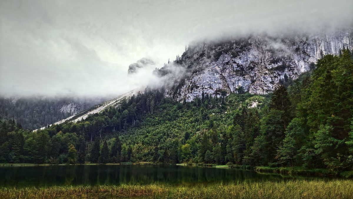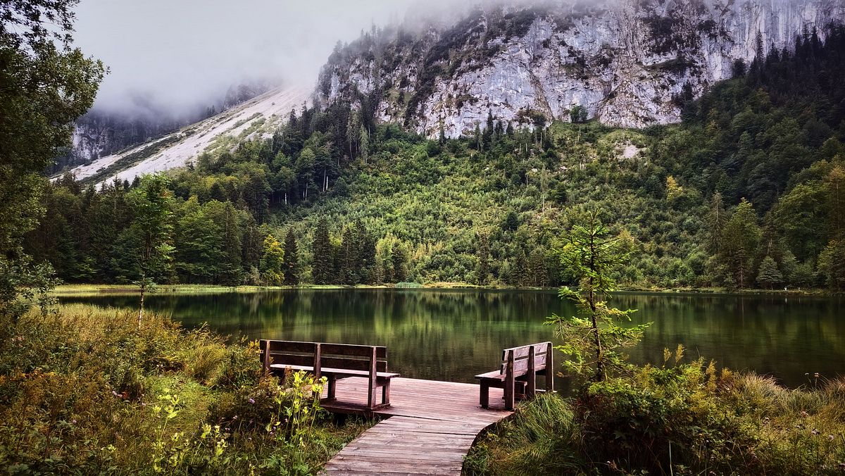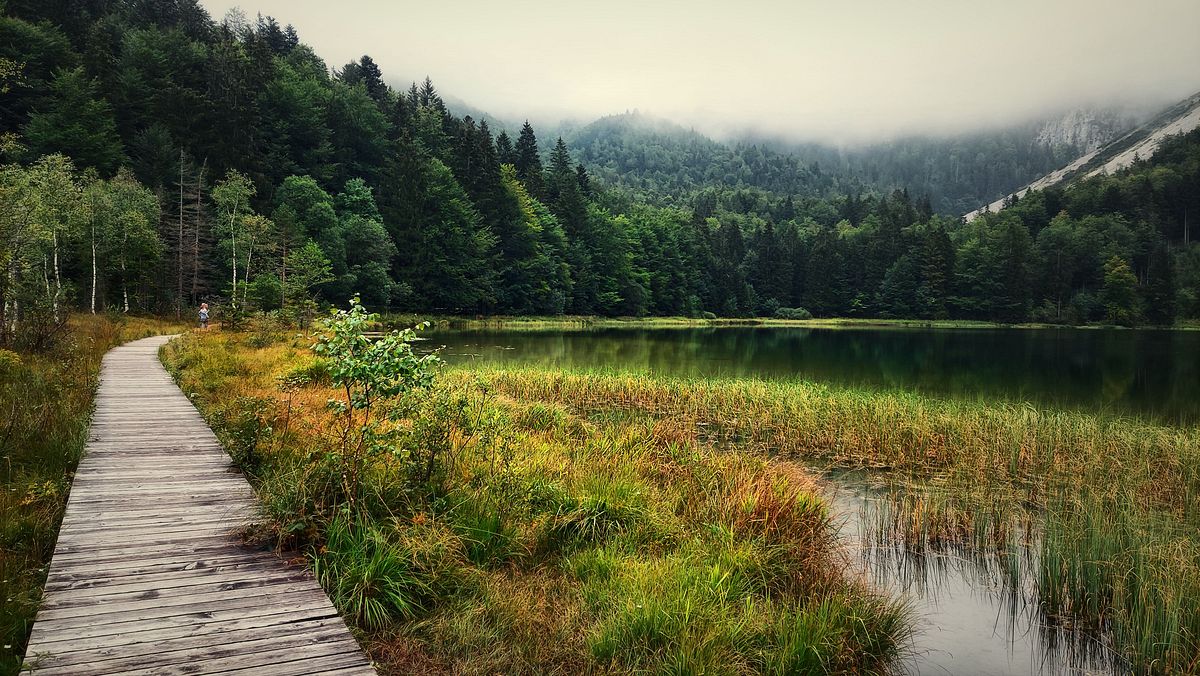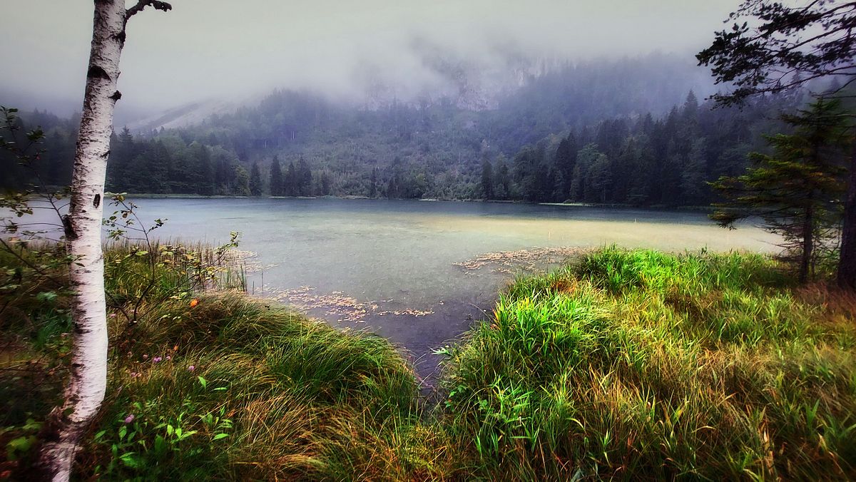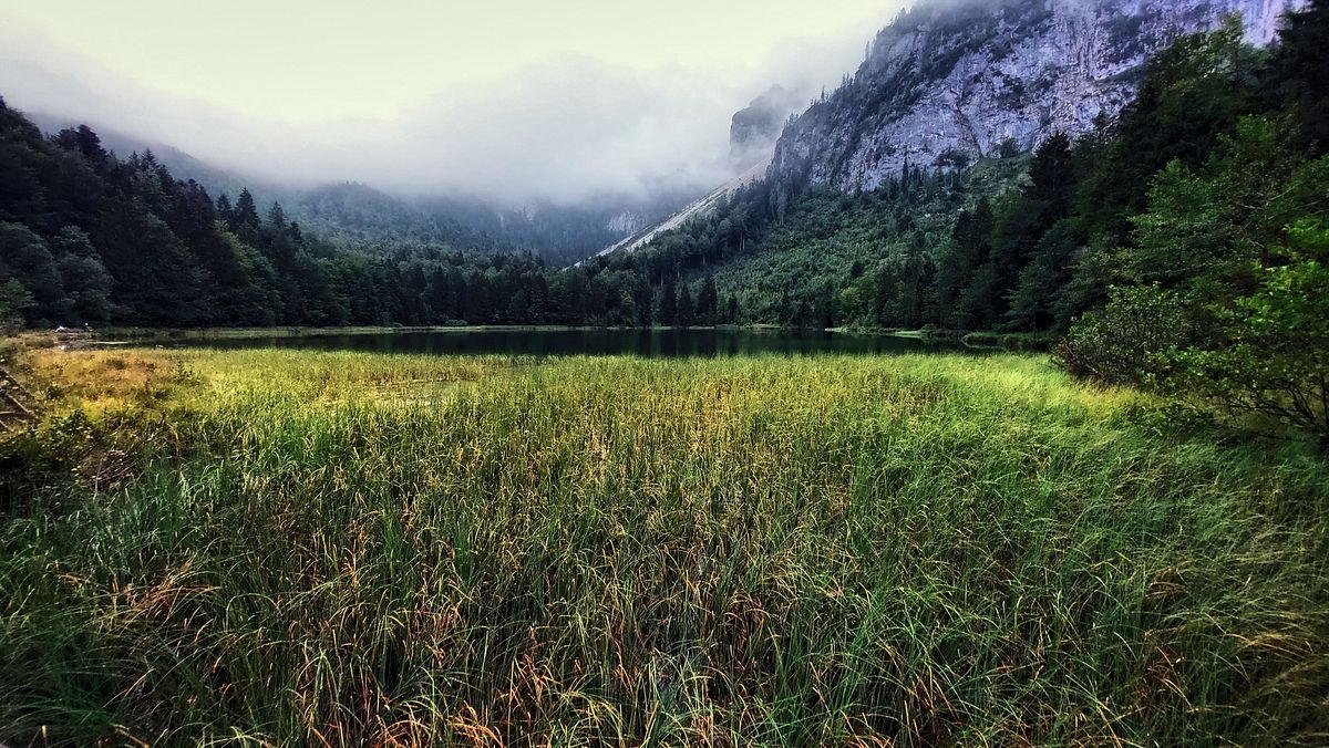 Eine Holzplattform samt Sitzbänken lädt direkt am Ufer zum Verweilen ein. Libellen tanzen um uns herum. Der Blick wandert über den See auf die dahinter aufragenden Felswände der Dunkelwand und auf einen Schuttkegel des Zwiesels, die beide zum Greifen nahe wirken. Heute freilich hüllen sich die Felsen in Wolken. Doch hin und wieder lockert es etwas auf und der ein oder andere Fels taucht für kurze Zeit aus dem Nebel auf. Mystischer geht es fast nicht mehr. Schade, dass ich meine Kamera nicht dabei habe…