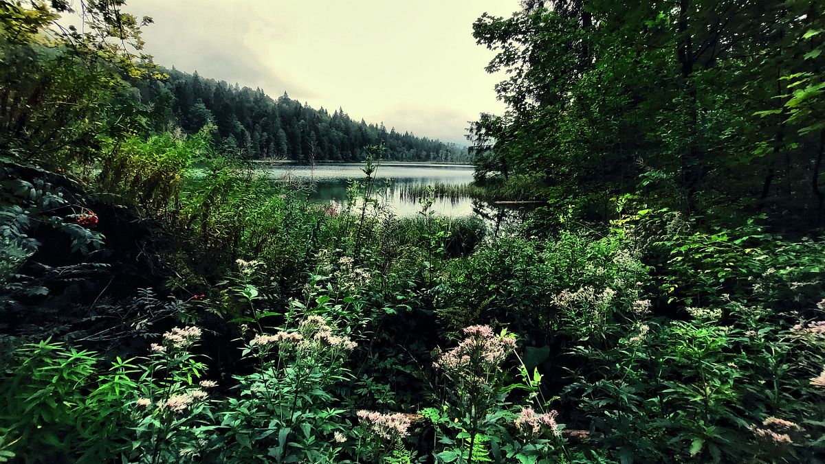 Weiter geht es der Forststraße entlang. Immer wieder bieten sich Ausblicke auf den See. Wir passieren einen Abschnitt unterhalb der Dunkelwand, an dem vor einigen Jahren eine Lawine große Verwüstungen angerichtet hat. Hier lässt sich gut erkennen, wie schnell Sukzession, also die Entstehung von Wald, passiert. Pioniergehölze wie Ahorn und Weiden schießen bereits wieder hoch auf. Das Aufforsten mit Buche, Fichte und Tanne, die erst wieder frei geschnitten werden müssen, damit sie sich richtig entwickeln können, hätte man sich getrost sparen können. Die Natur regelt das von alleine. Aber es entspricht wohl der geltenden Weltanschauung der Forstwirtschaft, dass genau diese Bäume hier zu wachsen haben und man nicht warten möchte, bis sie dies von alleine tun. Aber gut, das ist nun wirklich Jammern auf hohem Niveau in Anbetracht dieses wunderschönen Ortes.