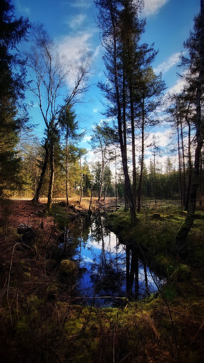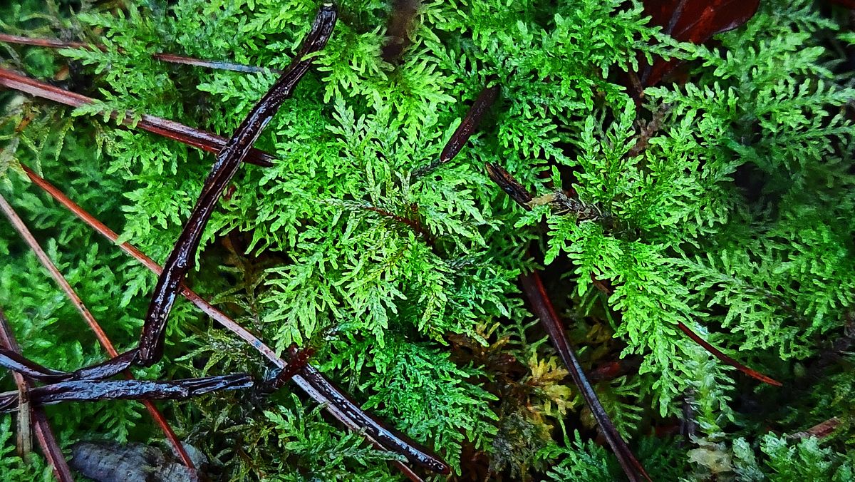 Einer dieser Ausflüge führt uns wieder einmal nach Bayern. Das heutige Ziel ist der (oder das?) Schönramer Filz im Landkreis Traunstein. Die Sonne lacht vom fast wolkenlosen Himmel. Als hätten sie den Frühling verschlafen, strecken die Laubbäume ihre kahlen Äste in das blaue Firmament. Doch es gibt auch viel Grün zu entdecken, wenn man den Blick auf den Boden richtet: Moose freuen sich sehr darüber, dass es um diese Jahreszeit kaum abtrocknet. Auf dem feuchten Waldboden laufen sie (ohne die Konkurrenz durch höhere Pflanzen) zur Höchstform auf. Die Heidelbeeren tragen zwar keine Blätter, aber ihre grünen Stiele geben trotzdem ein kräftiges Lebenszeichen.