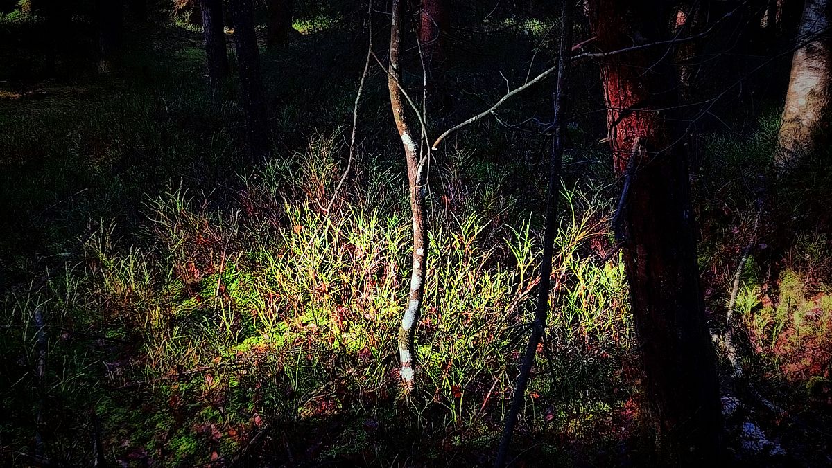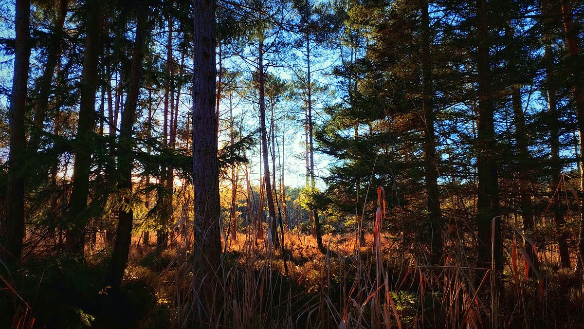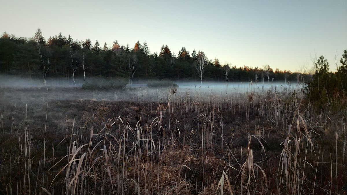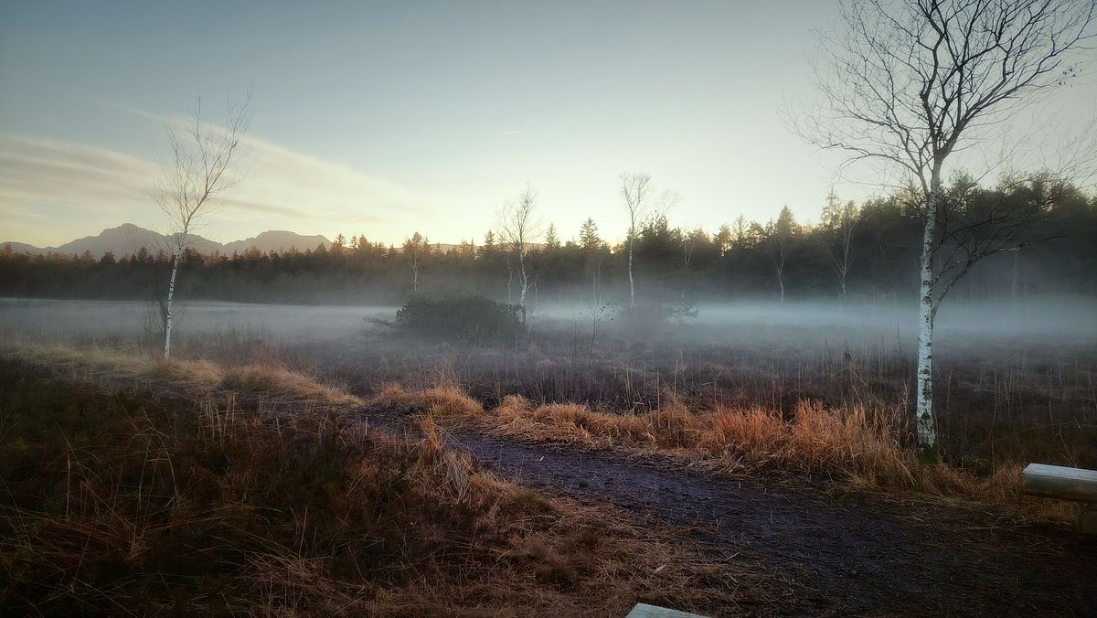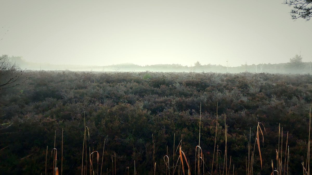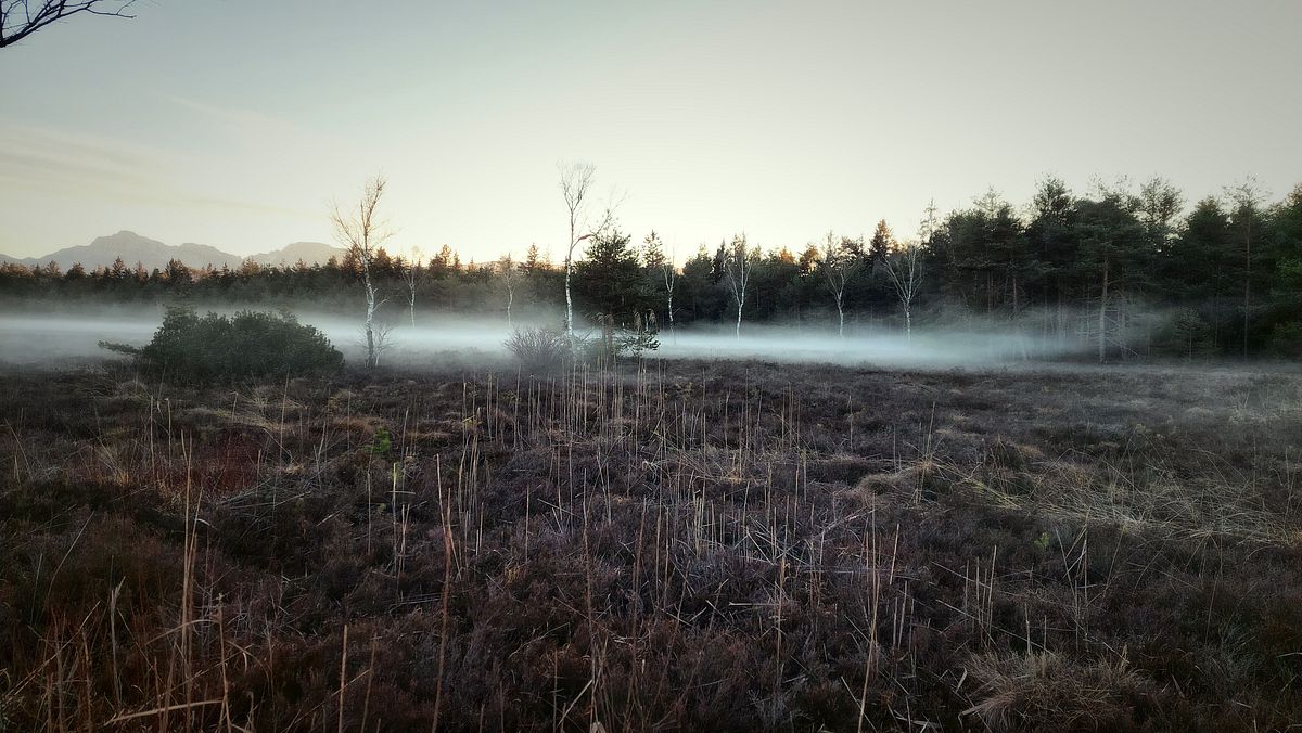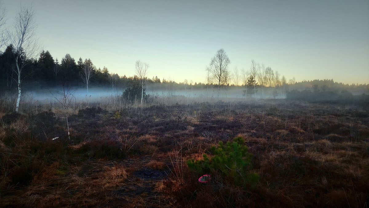 Im Bereich der großen Heidefläche westlich des Moorsees passiert es dann auch, als plötzlich Nebelschleier aufziehen. Welch ein glücklicher Zufall! Und ich ohne meine Kamera! Die Sonne ist bereits hinter den Bäumen verschwunden und der Nebel – auch wenn es nicht viel ist – legt seinen mystischen Schleier über die Szenerie. Es ist ein fantastisches Bild, das sich uns bietet. Ärger darüber, dass ich meine Kamera wieder nicht dabei habe, kommt auf. Aber ärgern hilft nunmal nichts und so versuche ich was geht aus der Handykamera herauszuholen.