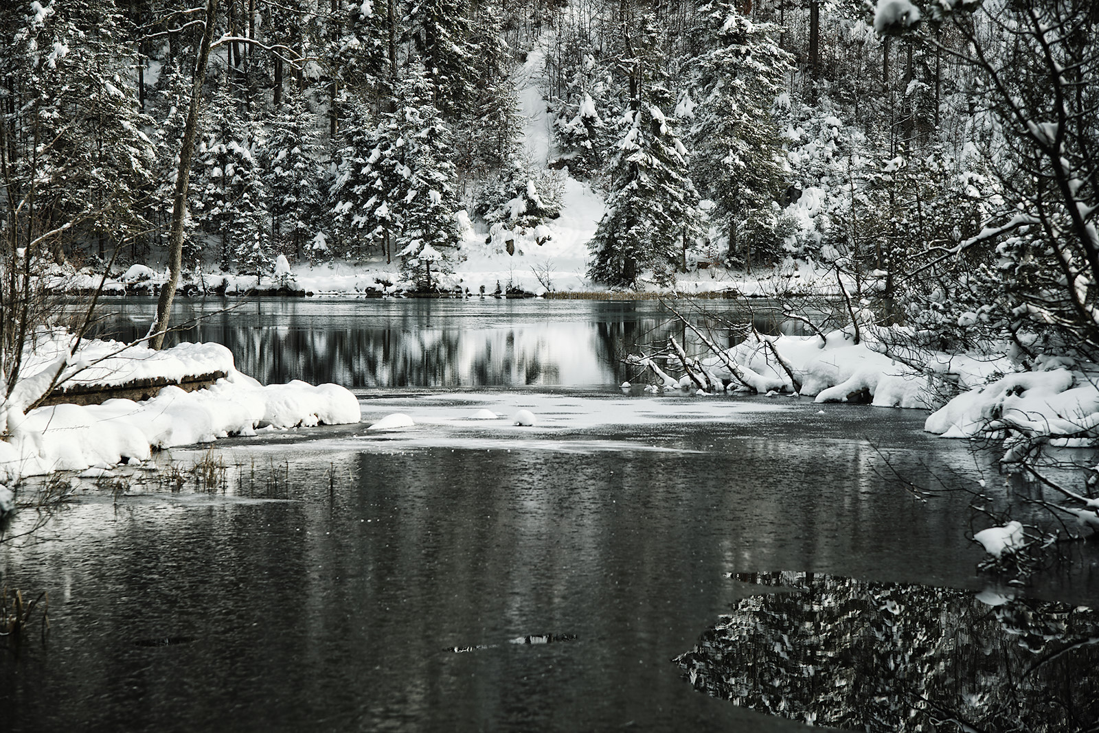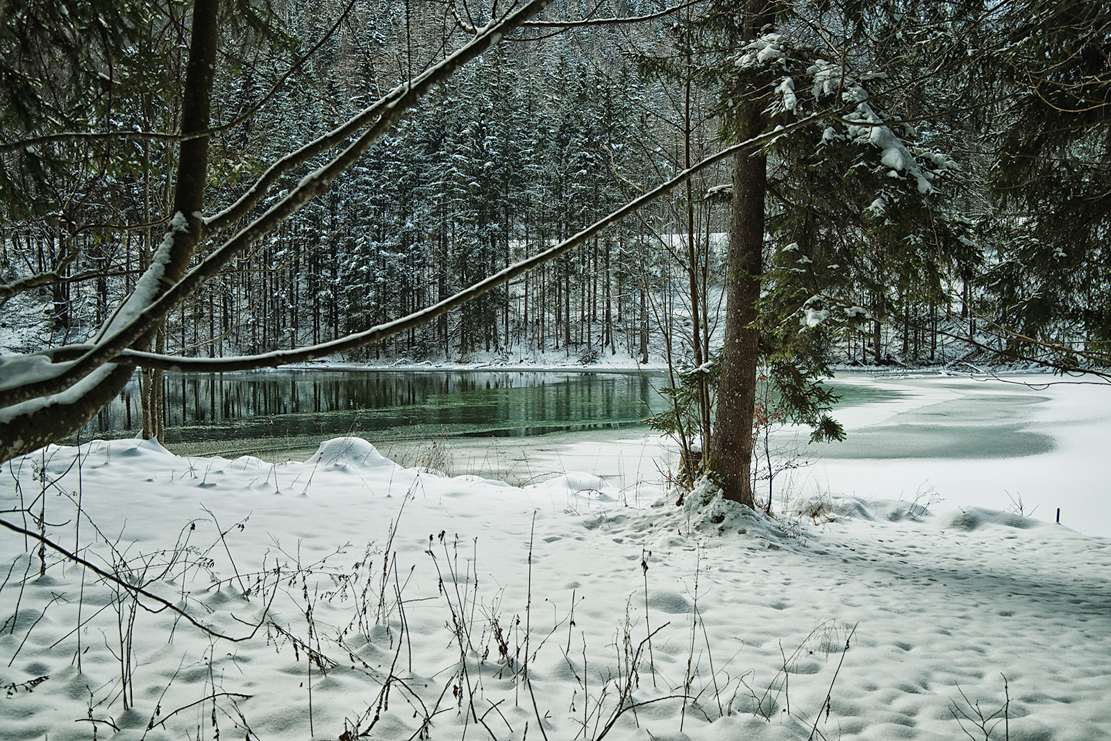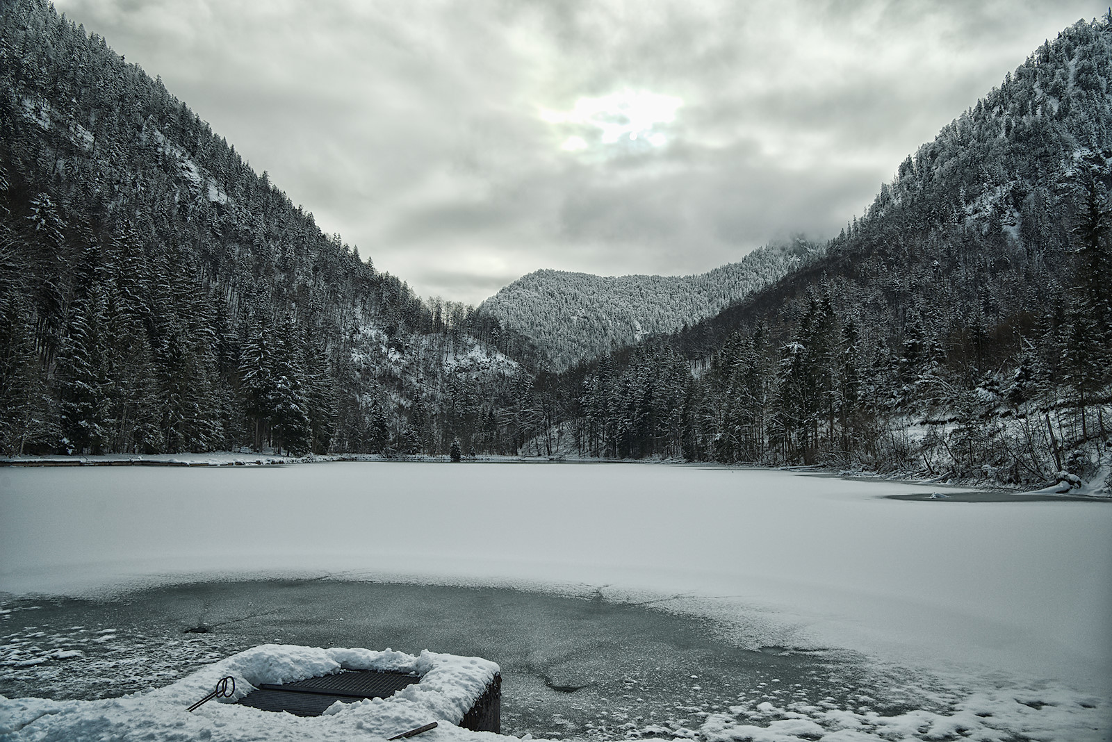 Baden kann man heute freilich nicht, es sei denn man ist hartgesotten und mit entsprechendem Werkzeug ausgerüstet. Der Zwingsee ruht nämlich unter einer dicken Eisdecke. Nur der hintere Bereich ist eisfrei. Hier zeigt er sich äußerst idyllisch, mit kleinen, durch Landbrücken abgetrennten Becken.