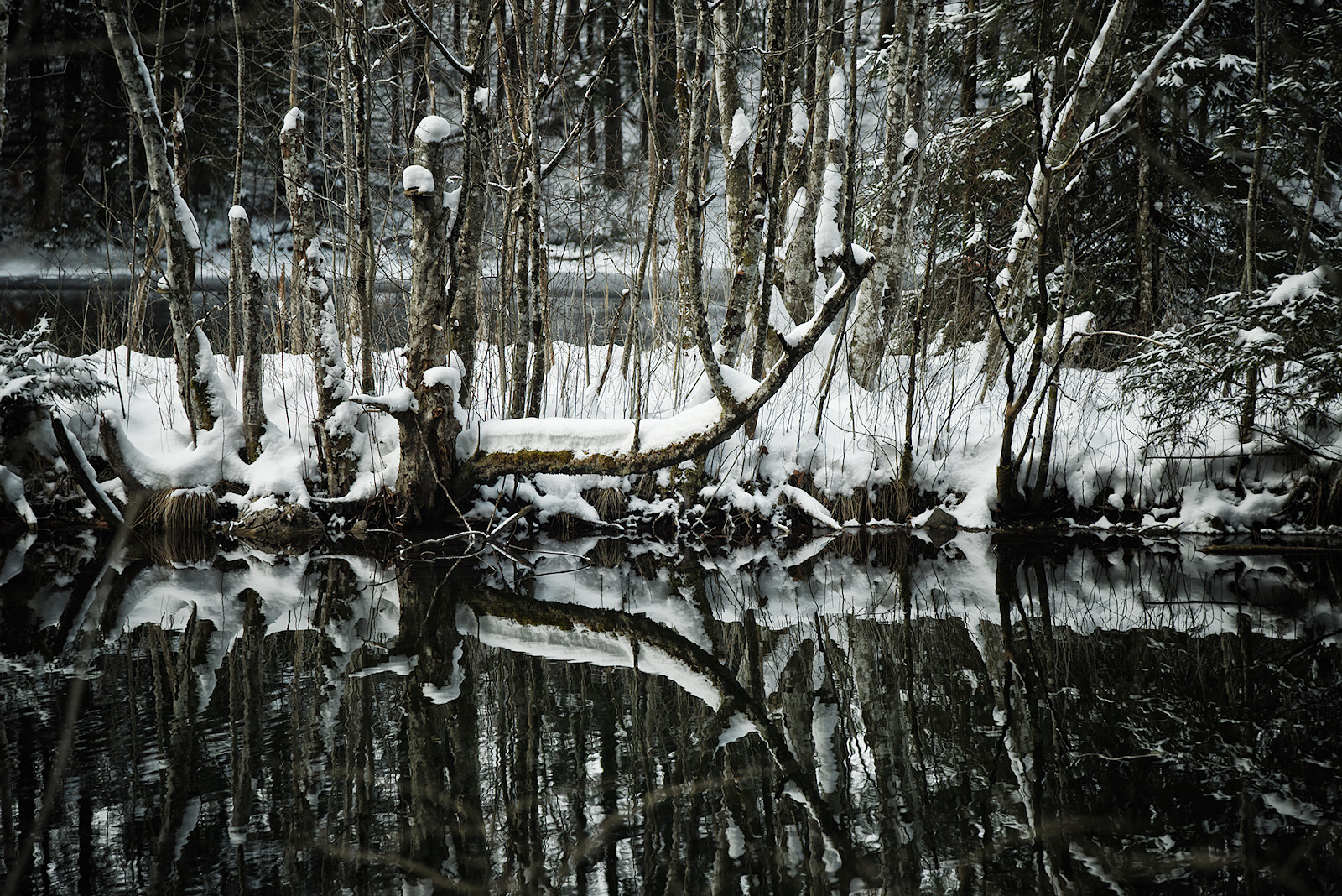 Bald nach der Lichtung wird es abseits des befestigten Weges etwas mooriger. Dunkle Wasserflächen heben sich überdeutlich vom schneebedeckten Erdboden ab. Schließlich taucht er rechts unterhalb des Weges auf: Der Falkensee.