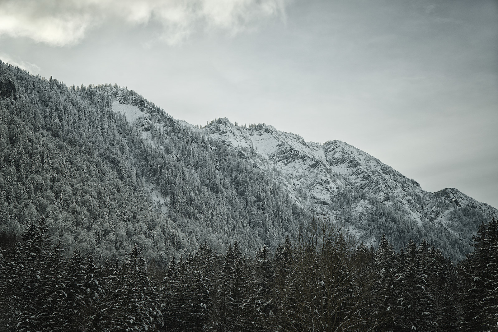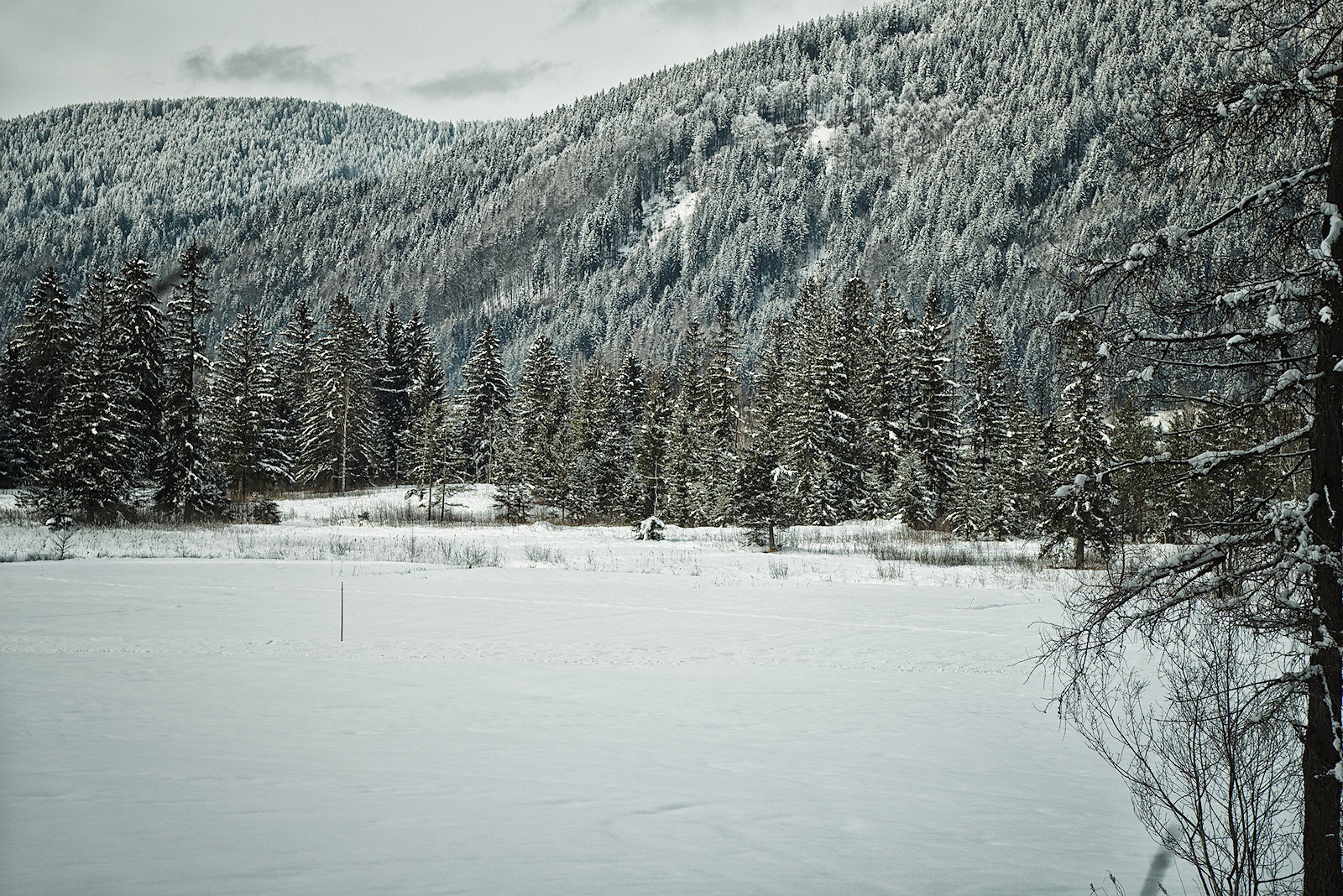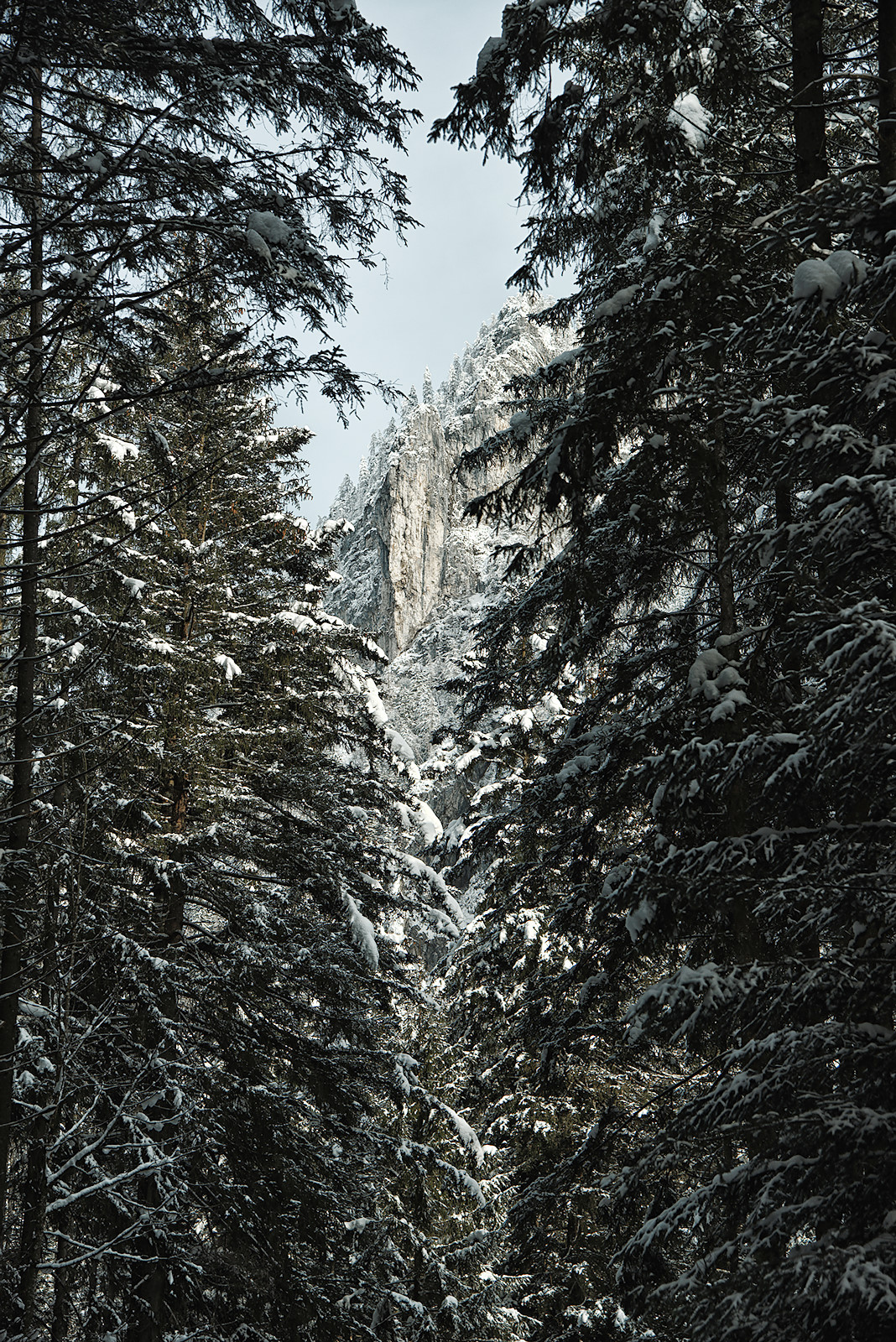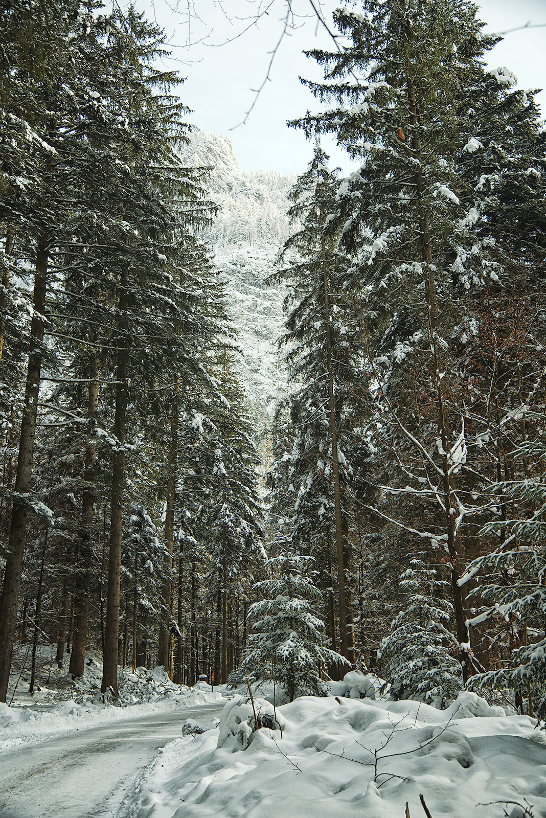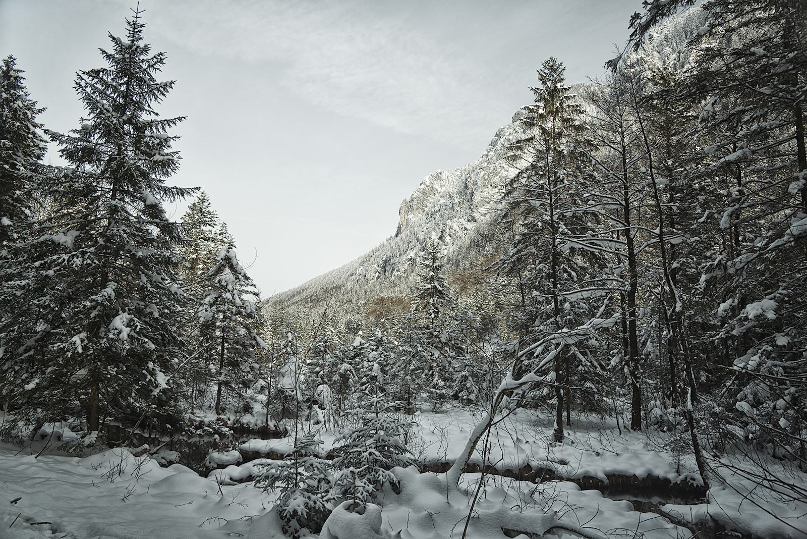 Der Weg zum nächsten Highlight verläuft hauptsächlich durch Wald. Mächtige Fichten säumen die nun wieder perfekt schneegeräumte Forststraße. Dazwischen blitzen immer wieder die schneebedeckten Felswände eines Gebirgszuges im Osten durch. Bald erreiche ich eine Lichtung und die Felswände türmen sich in voller Größe vor mir auf. Es handelt sich beim Gebirgszug um einen Ausläufer des Staufenmassivs, der – soweit ich aus der Karte herauslesen konnte – keinen eigenen Namen hat. Der höchste Gipfel ist das Gruberhörndl (1493 Meter).