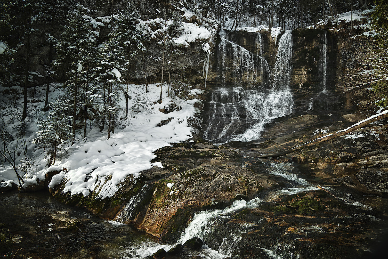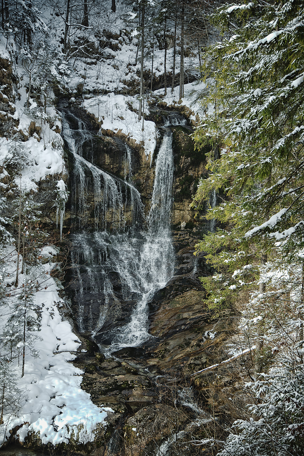Der Weg, der nun nicht mehr barrierefrei ist, führt wieder auf die Deutsche Alpenstraße zu, biegt zuvor allerdings nach links ab, überquert einen Bach und führt schließlich über eine Treppe sehr spektakulär unter der steinernen Straßenbrücke hindurch. Unterhalb der Straße geht es entlang der ehemaligen Soleleitung – das dicke Stahlrohr liegt immer wieder vor den Füßen herum – zum Wasserfall. Von oben ist die Sicht durch die Bäume deutlich eingeschränkt. Allerdings führt ein Treppenweg – bei Schnee ziemlich rutschig! – direkt zur Prallzone des Weißbachfalls hinunter. Trotz der kalten Witterung ist der Fall nicht schlecht gefüllt. Im Sommer ist er allerdings noch schöner, wenn man sich auf den Steinterrassen niederlassen kann. Ein Kraftplatz und ein Highlight, das man auf der Falkensteinrunde unbedingt mitnehmen sollte!