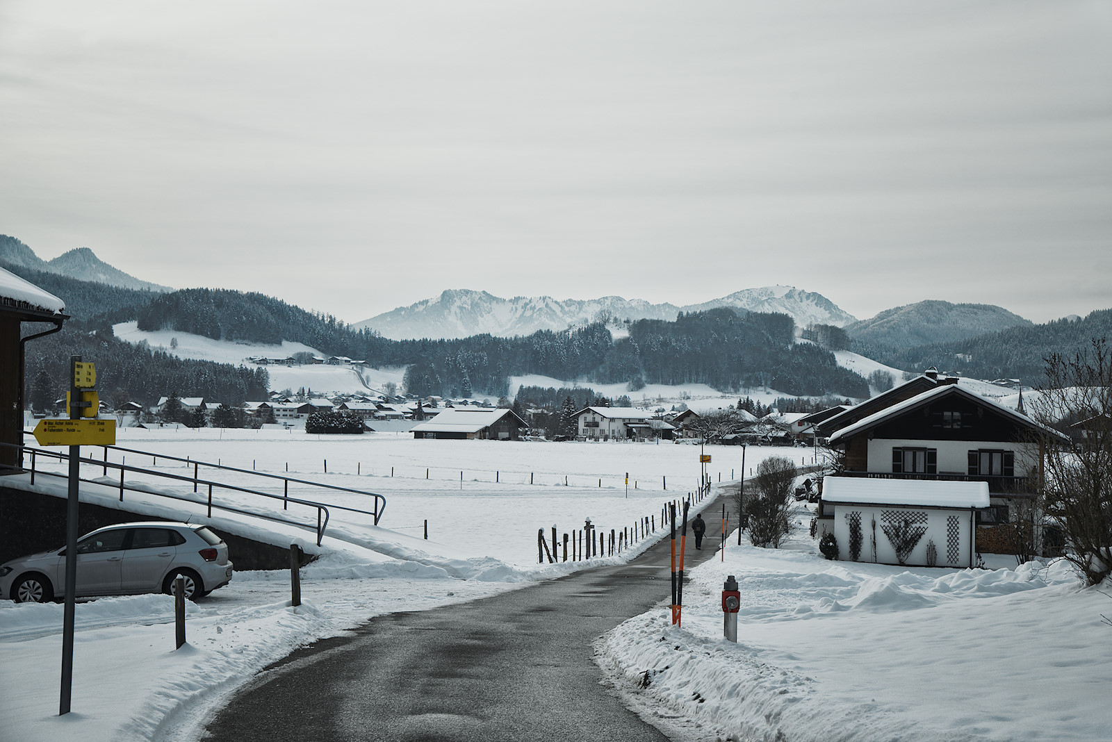 Am Einstieg zur Langlaufloipe erreiche ich schließlich den Ortsrand von Inzell. Noch schnell ein Blick zurück auf das Gruberhörndl, dann verläuft die Falkensteinrunde weiter durch Siedlungsgebiet. Macht aber nichts, denn die Sonne verschwindet ohnehin gerade hinter dem Streicher.