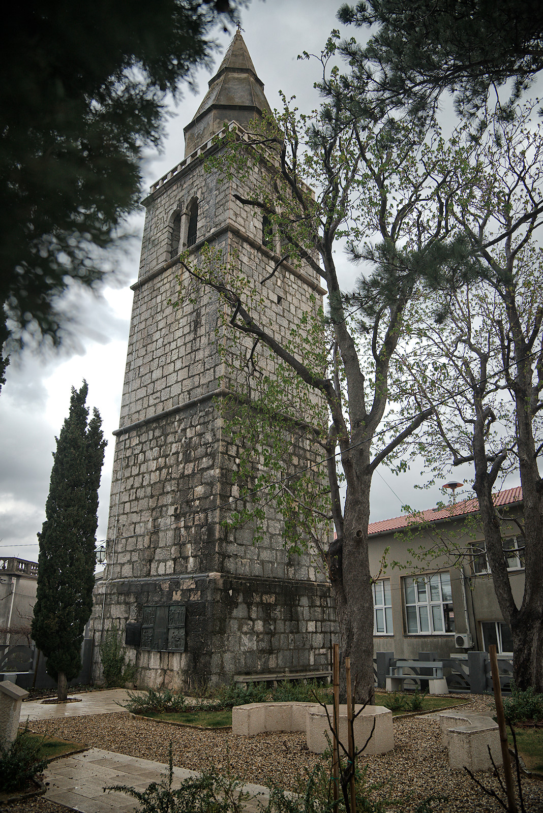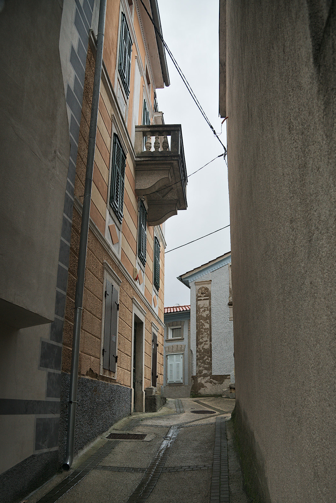 Ziemlich hartnäckig hält sich der Regenschauer über uns. Als das Ärgste vorbei ist, wollen wir uns das Städtchen noch etwas ansehen. Enge Gassen mit alten Häusern – zum Teil renoviert, zum Teil aber auch etwas verfallen – prägen das Antlitz von Dobrinj. Das Zentrum bildet der Platz vor der Dreifaltigkeitskirche. Der Glockenturm ist – so wie meist in Kroatien – freistehend neben der Kirche. In diesem Fall ist der Abstand zwischen beiden jedoch so groß, dass dazwischen sogar ein kleiner Park Platz findet.