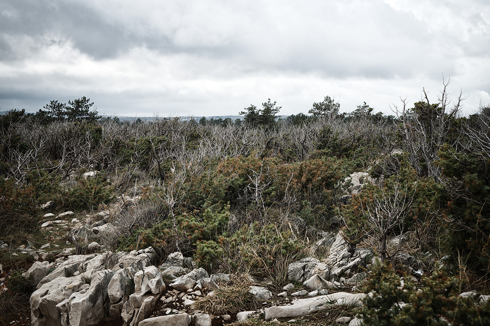 Doch die Bäume und Sträucher sehen nicht nur ob des kargen Bodens so mitgenommen aus: Hier im Norden der Insel fegt die Bura sehr stark über das Land und lagert ihre salzige Fracht, die sie zuvor aus dem Meer aufgenommen hat, auf die Vegetation ab. Viele Sträucher sehen deshalb wie verbrannt aus, als Folge der häufigen natürlichen Salzstreuung. Auch diese Info haben wir von der Höhlenführung mitgenommen.