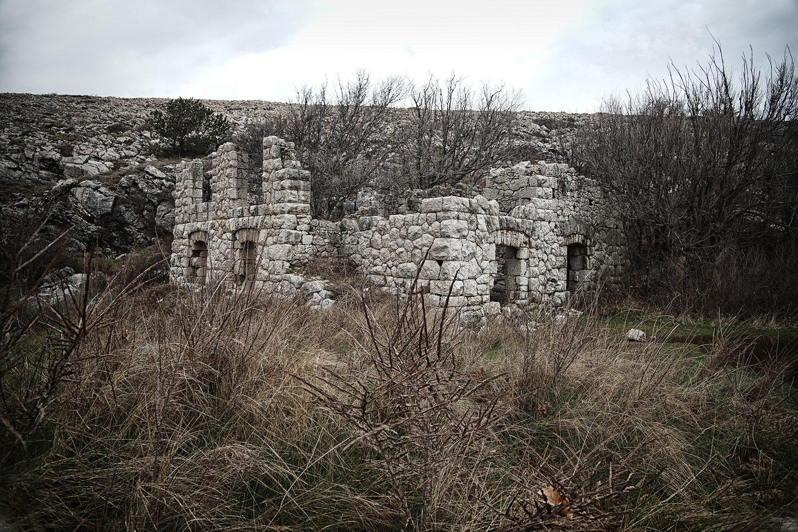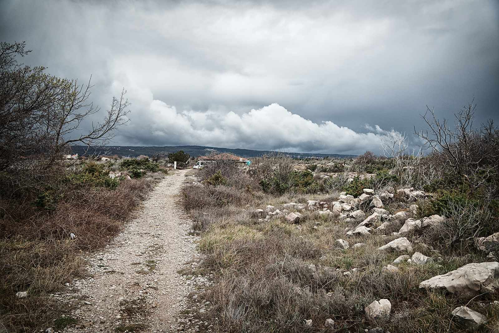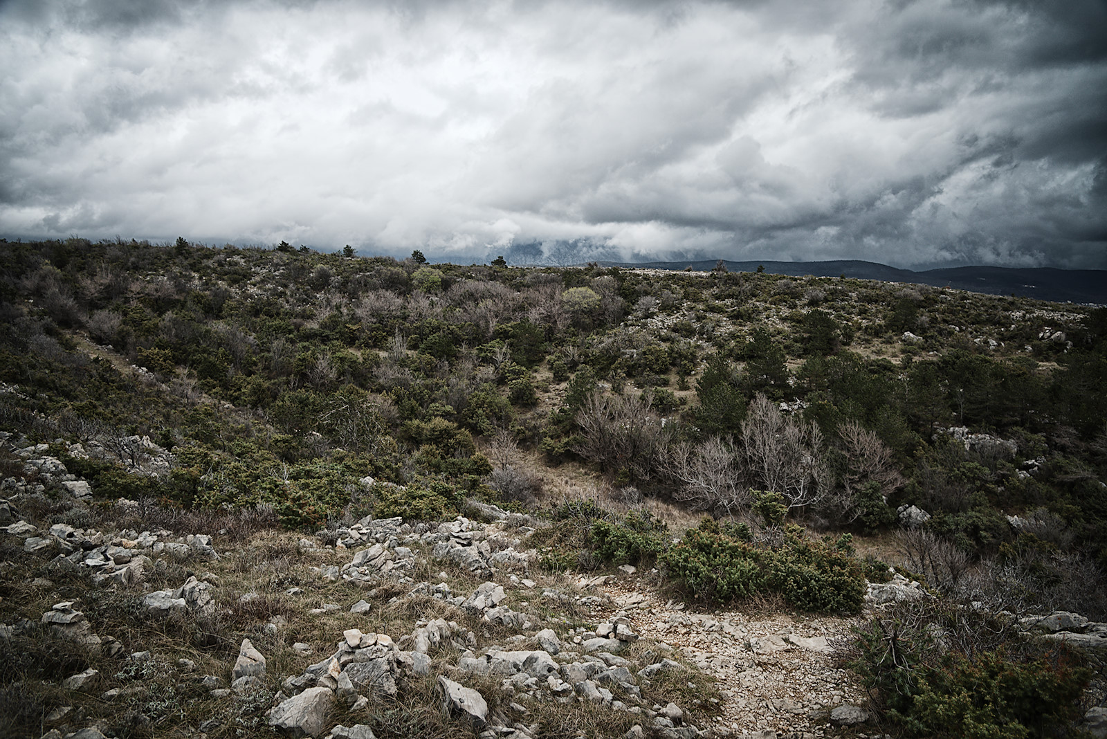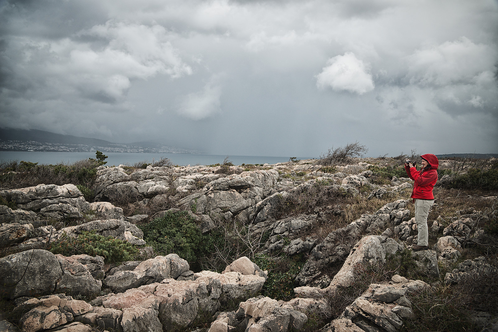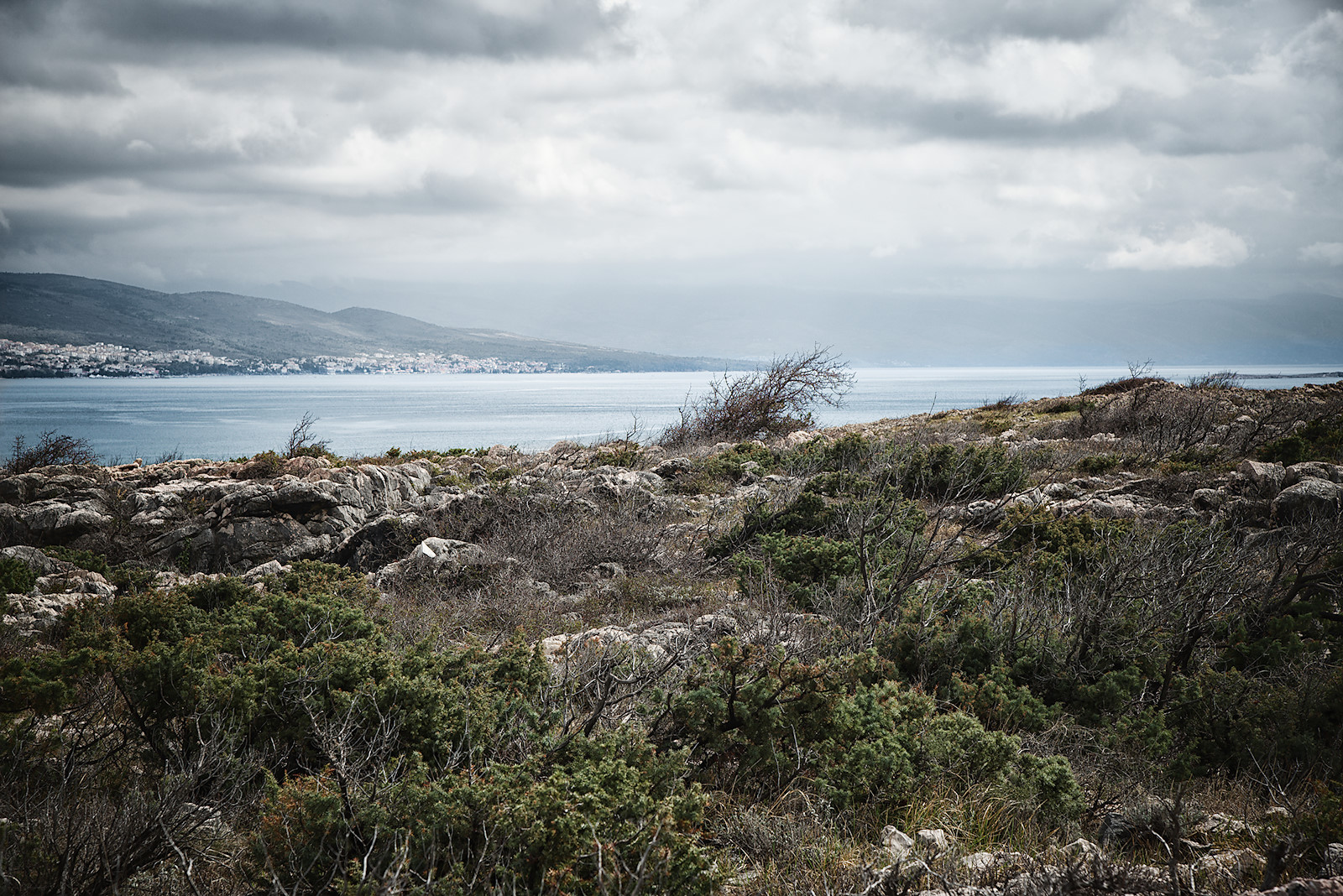 Als wir zurück zum Ausgang kommen, hören wir über uns Donnergrollen. Dunkle Wolken hängen über dem Küstengebirge des nahe gelegenen Festlandes. Wir sind wohl gerade noch einmal verschont worden. Doch schon sieht man in der Ferne einen gewaltigen Regenschleier über dem schmalen Meeresstreifen zwischen Insel und Festland heranrollen. Das offene Meer erblickt man von Krk aus übrigens nirgends, denn im Norden und Osten befindet sich das kroatische Festland, im Süden und Westen benachbarte Inseln.