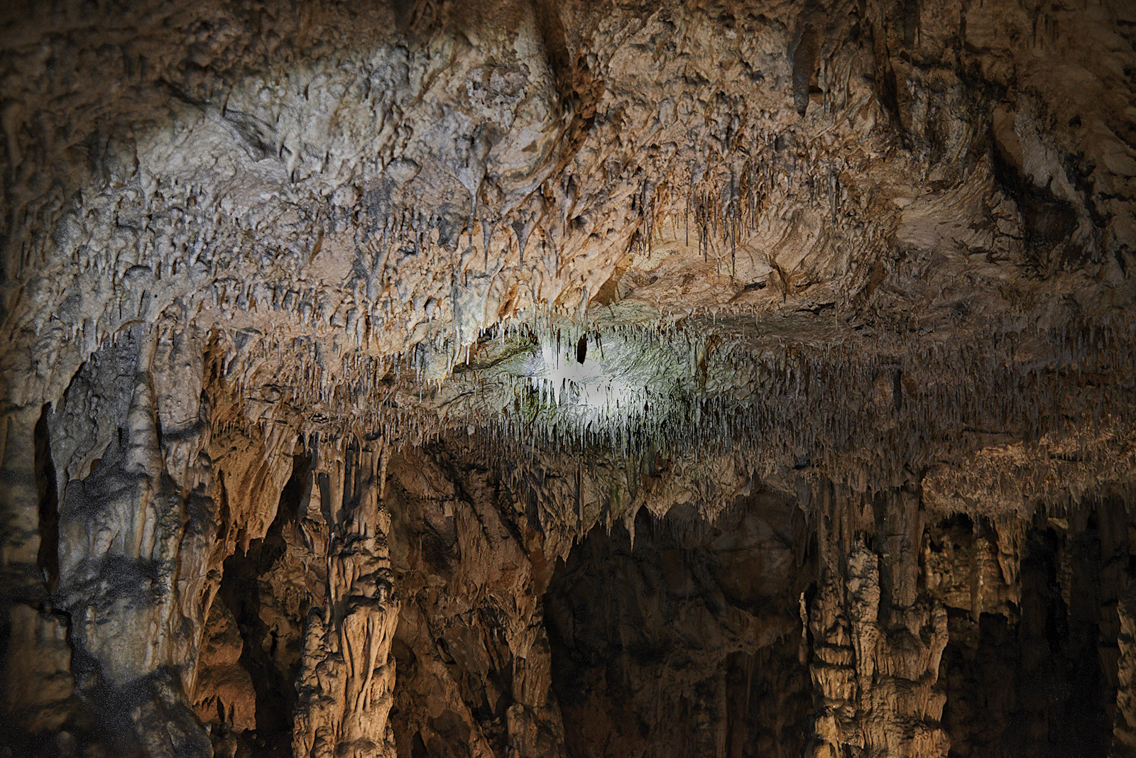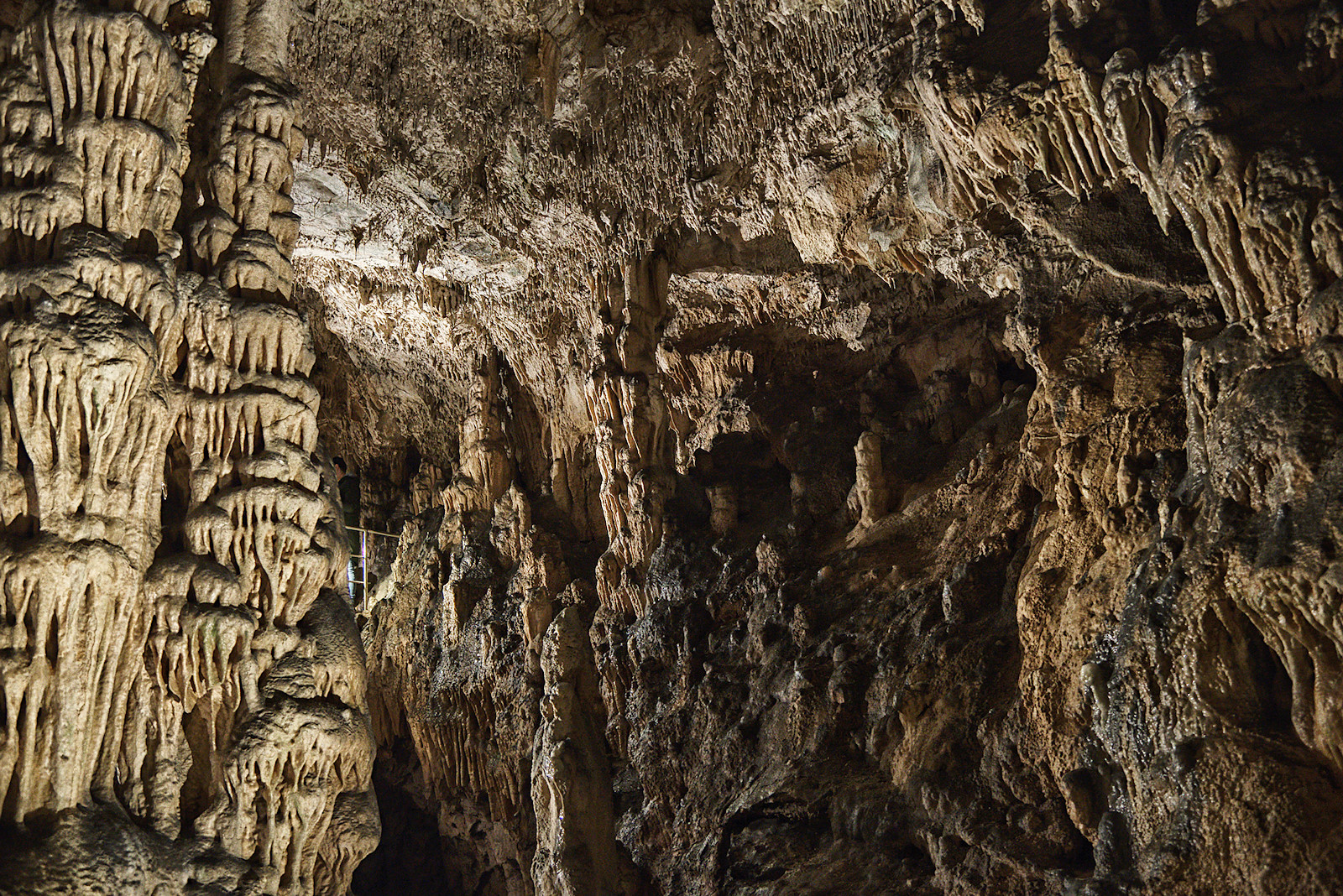 Ein schmaler Gang führt in zwei größere Hallen. Wie Wurzeln wachsen die Stalagtiten aus der Decke. Daran hängen – noch ganz benommen – einige Große Hufeisennasen, die gerade erst aus ihrem Winterschlaf erwacht sind. Eine schwache Beleuchtung sorgt dafür, dass man alles Wesentliche erkennen kann. Am beeindruckendsten finde ich die großen Vorhänge (= flächig wachsende Stalagtiten), sowie die unglaublich dichten Stalagtiten-Rasen an der Decke. Nicht zu vergessen, die dicken Baumwurzeln, die im hintersten Teil der Höhle, welcher nicht betreten werden darf, durch das Höhlendach brechen. Irgendwie haben sie es aber nicht auf die Fotos geschafft. Wer hätte gedacht, dass ich noch zu Lebzeiten die Wurzeln von unten sehen würde… 😉