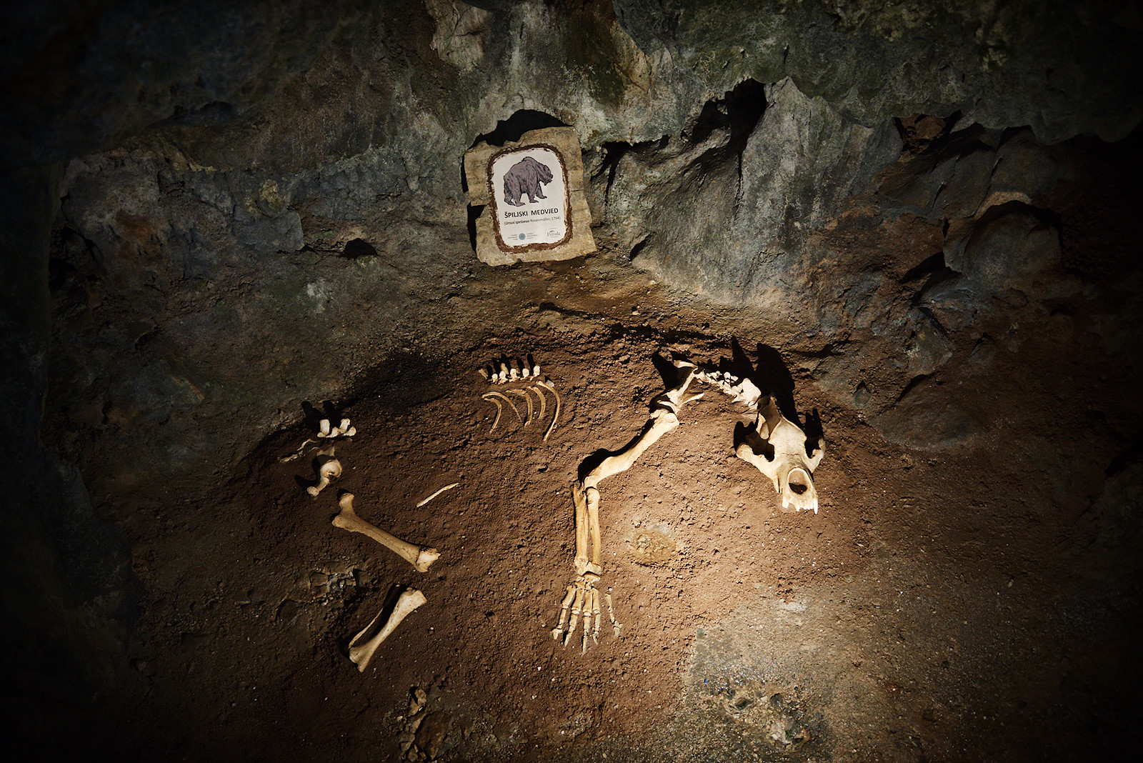 Das Erste, was es zu entdecken gibt, ist das Skelett eines Höhlenbären. Es liegt in einer kleinen, von Scheinwerfern ausgeleuchteten Nische, dort wo es ursprünglich vorgefunden wurde. Allerdings befinden sich die Originalknochen in einem Museum in Rijeka, bei diesen hier handelt es sich um Repliken.